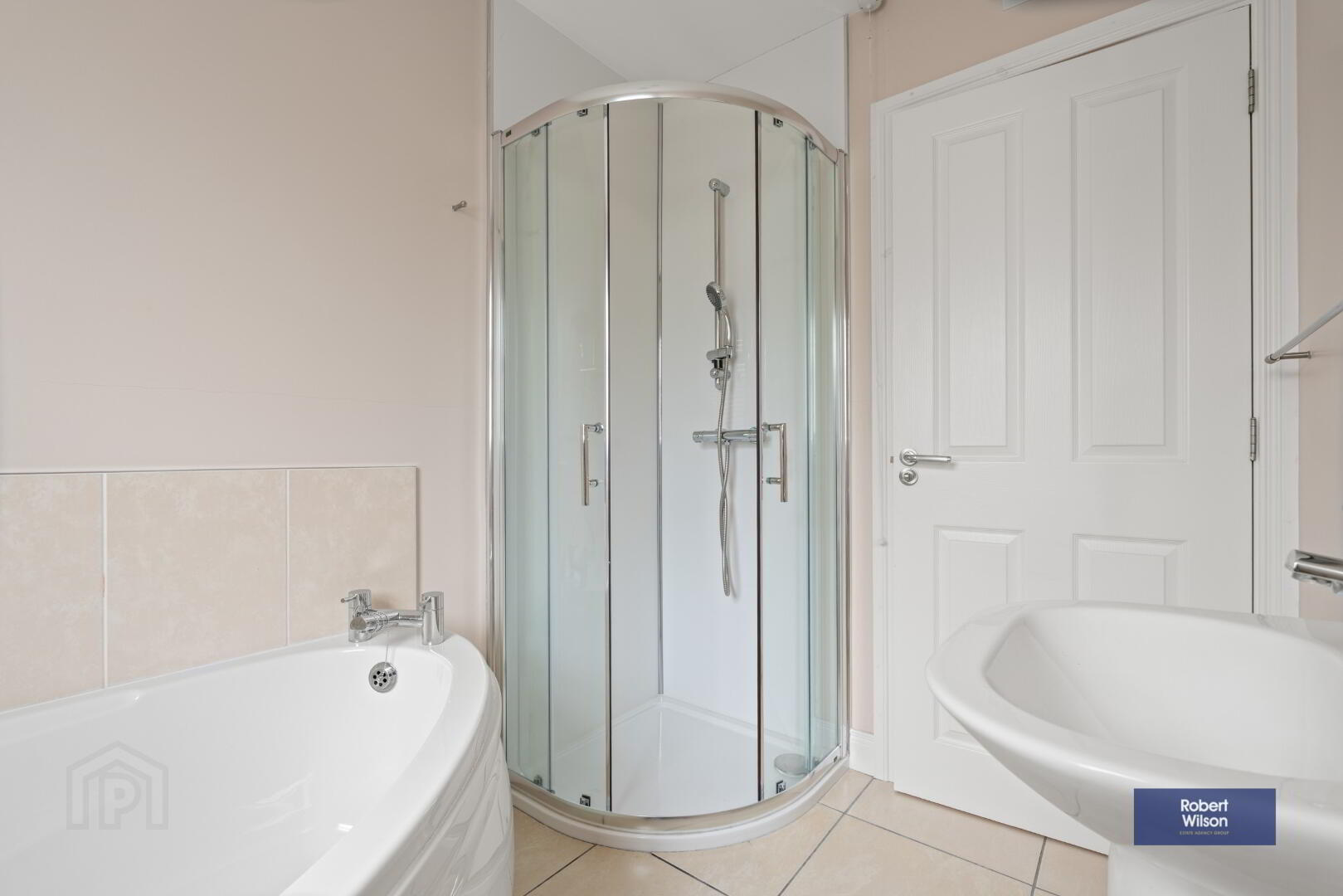 8' 3" x 5' 9" (2.51m x 1.76m) White suite comprising, wash hand basin, low flush W.C, walk in shower cubicle with mixer taps, corner bathtub with stainless steel mixer taps, tiled flooring, part tiled walls, extractor fan, wired for light up mirror, low voltage recessed lighting.