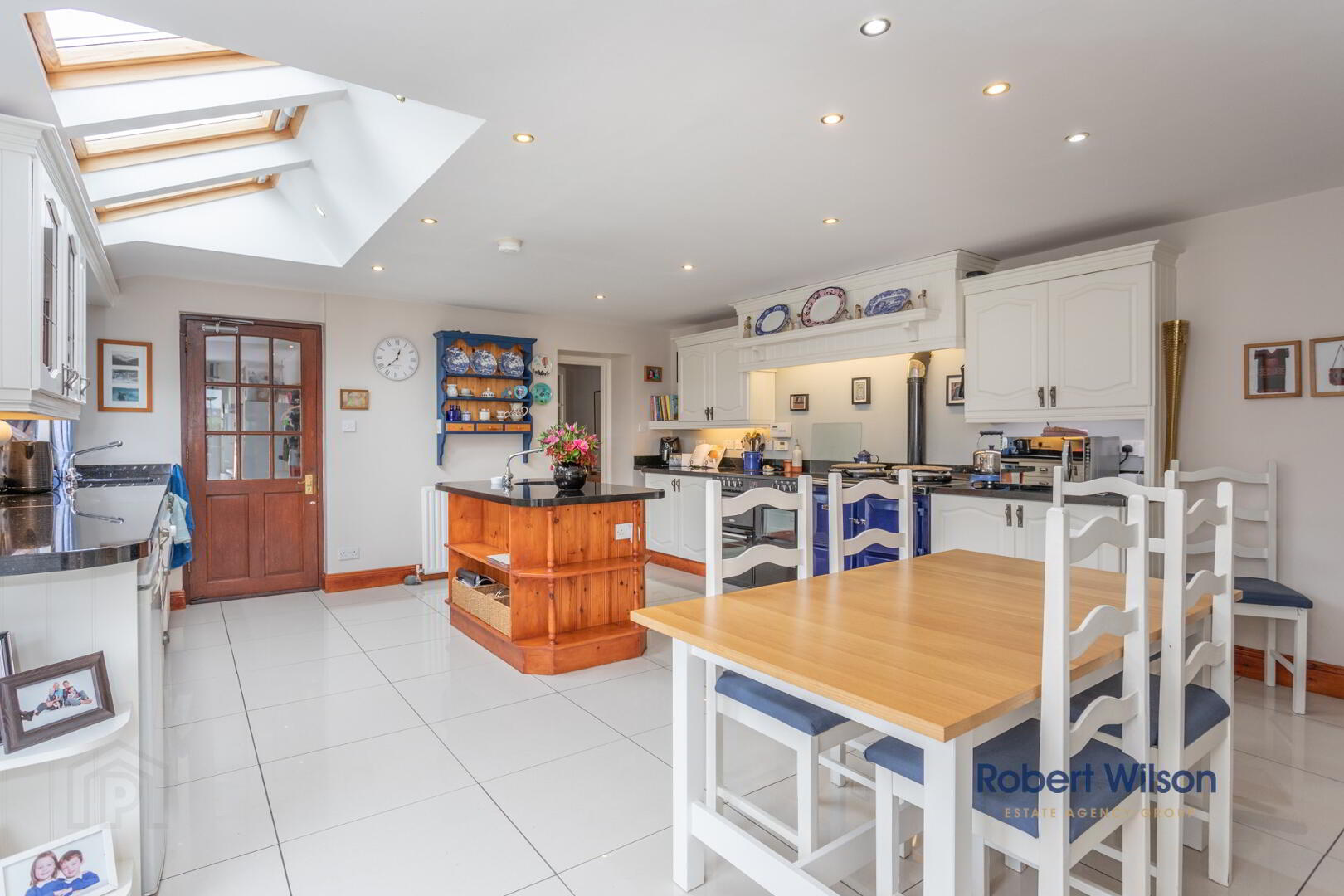 Fitted kitchen with range of high and low level units in solid wood , cream finish, granite worktops. Space for dishwasher, low level fridge, Belling style stove 'Red Fyre range cooker' canopy over, ceramic sink unit with mixer tap, tiled floor, Velux roof lights, centre island with stainless steel sink unit and mixer tap. Patio doors to the side garden.