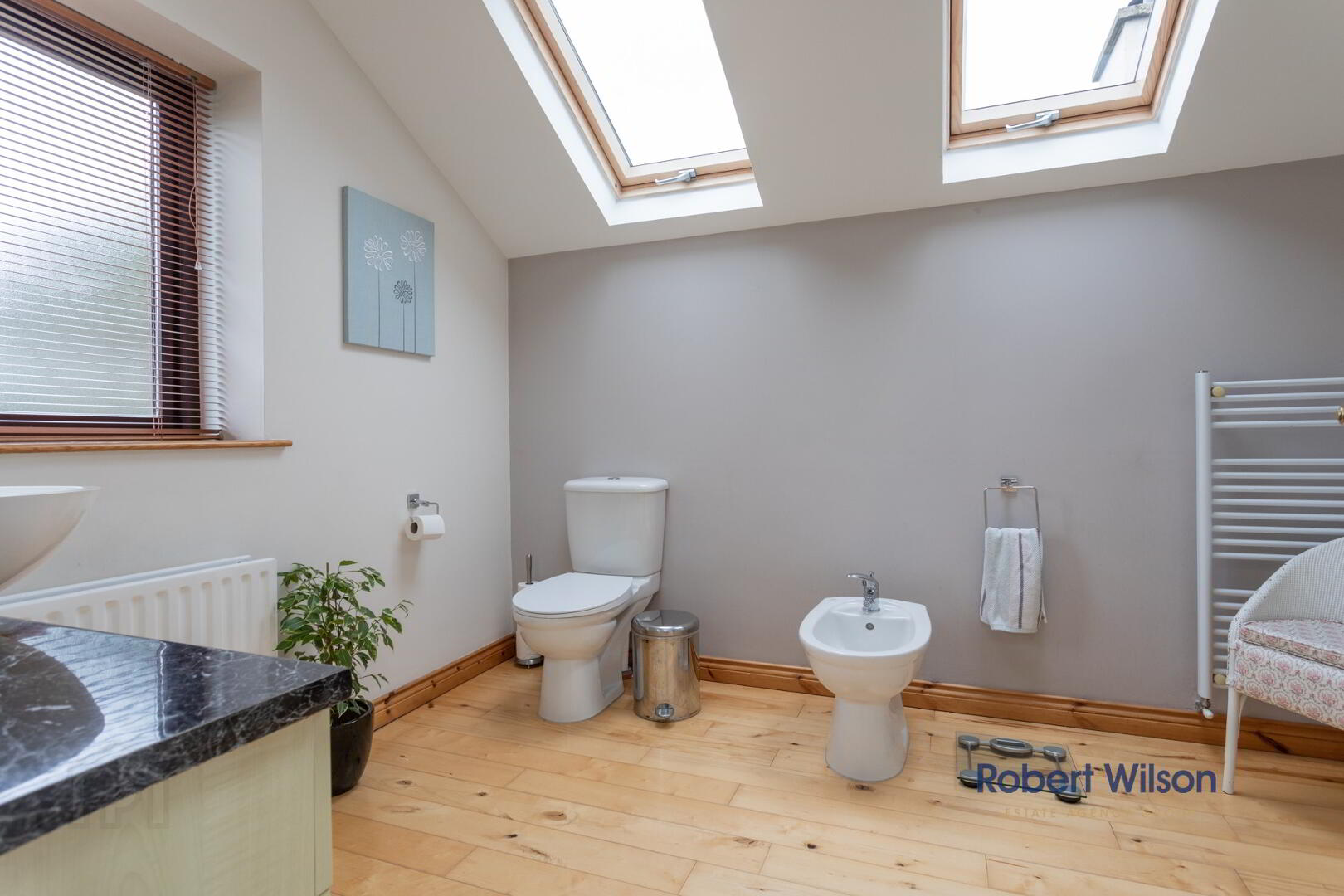 White suite comprising; low flush wc, bidet, walk in shower cubicle with Triton power shower, wash hand basin with mixer tap and vanity incorporated, extractor fan, heated towel rail, part tiled walls, wooden strip flooring.