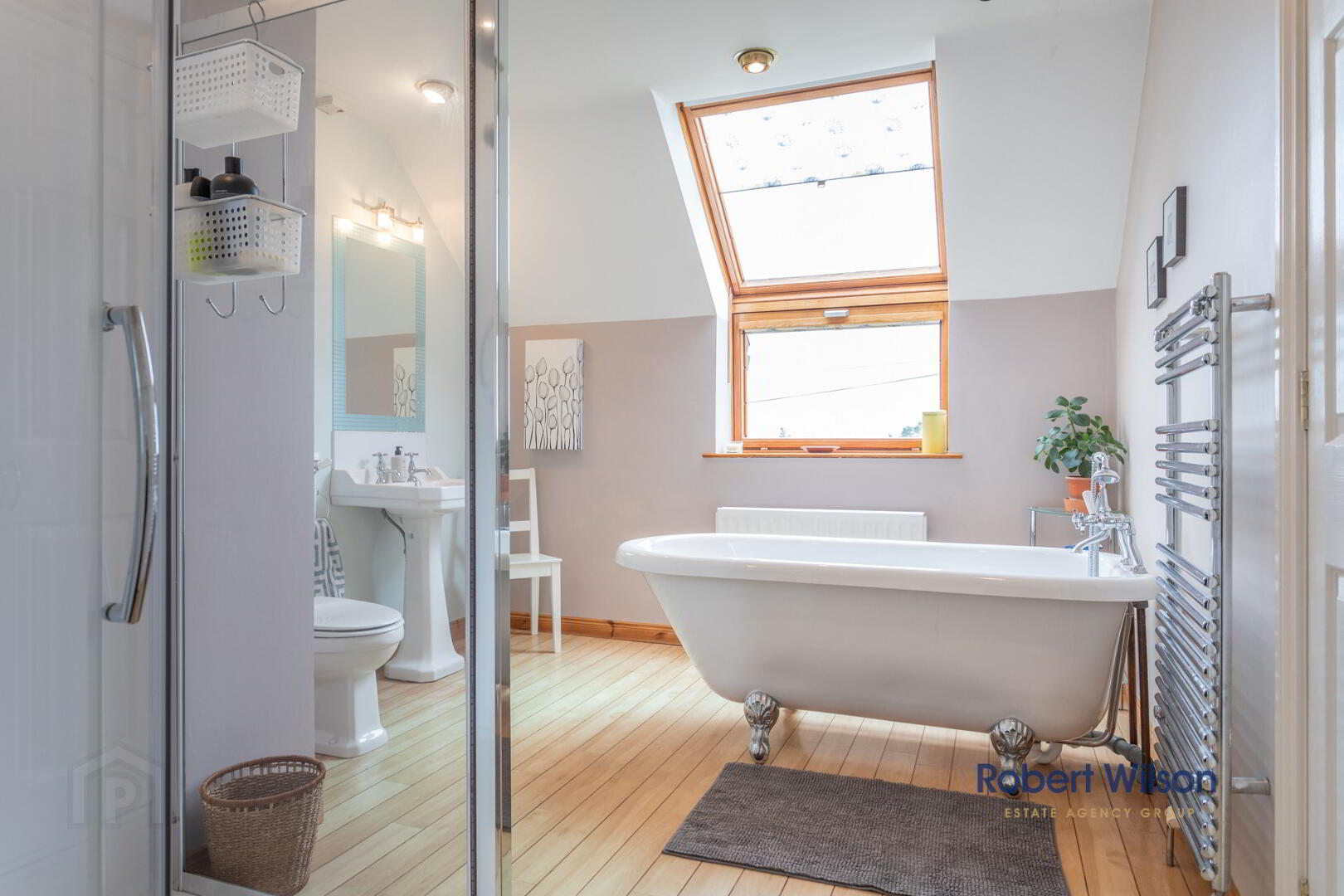 3m x 3.94m (9' 10" x 12' 11") White suite comprising: freestanding bath tub, pedestal wash hand basin, low flush wc, large walk in shower cubicle with rainfall fitting, heated towel rail, recessed lighting, hotpress, roofspace access.