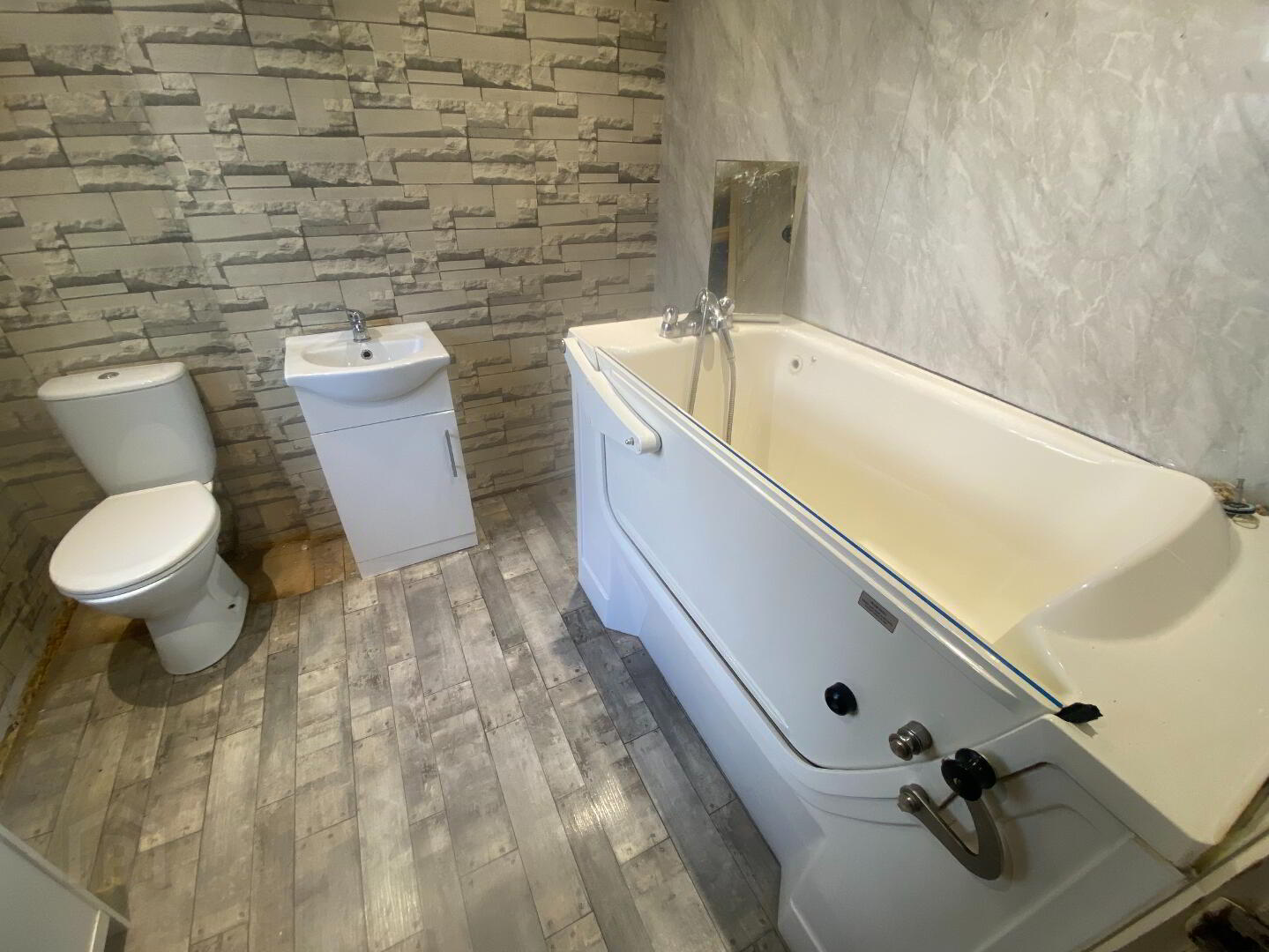 2.29m x 2.12m (7' 6" x 6' 11") Vinyl flooring, single panel radiator, WC, pedestal wash hand basin, walk in bathtub with shower over, recess lighting.