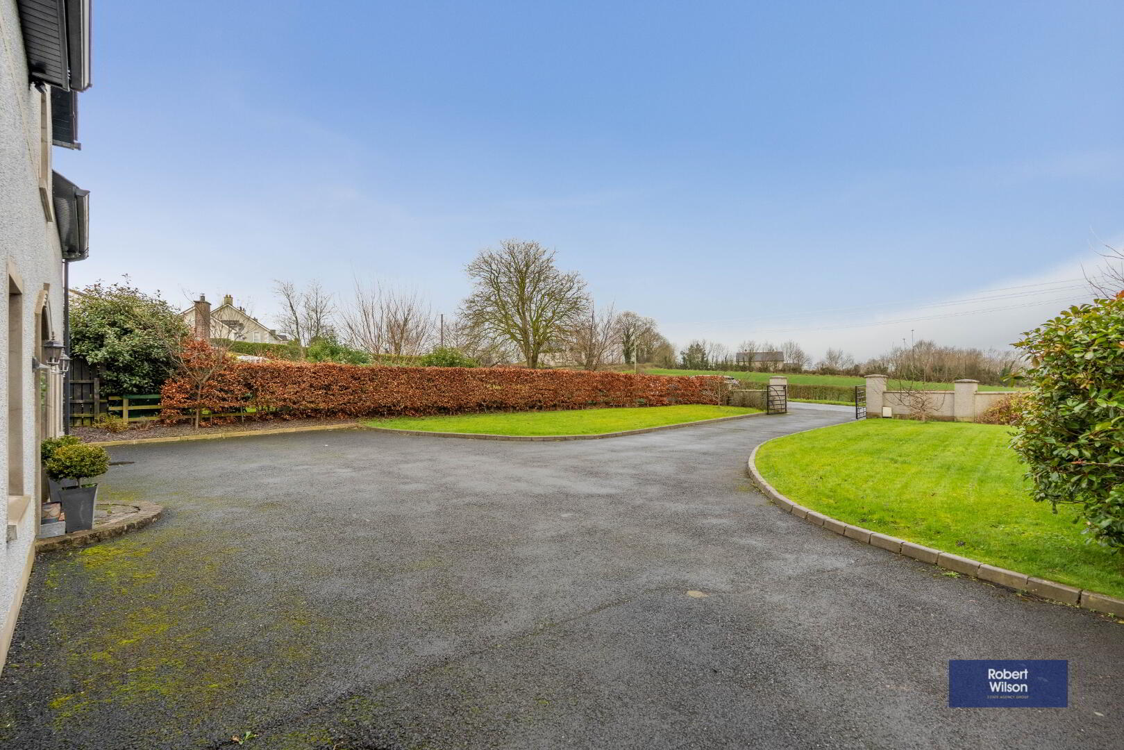 Front garden in lawn with tarmac driveway, wall and entrance gates.