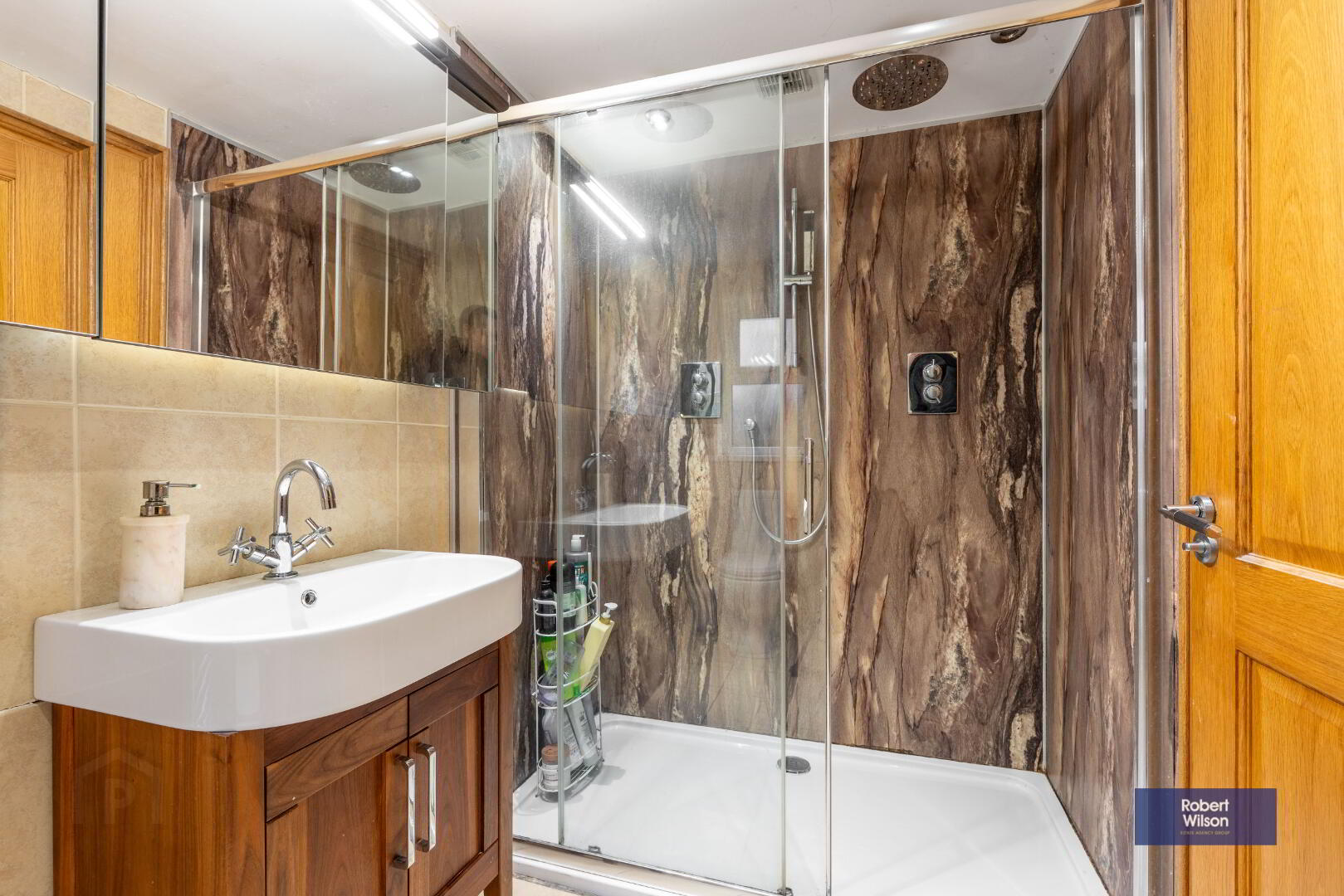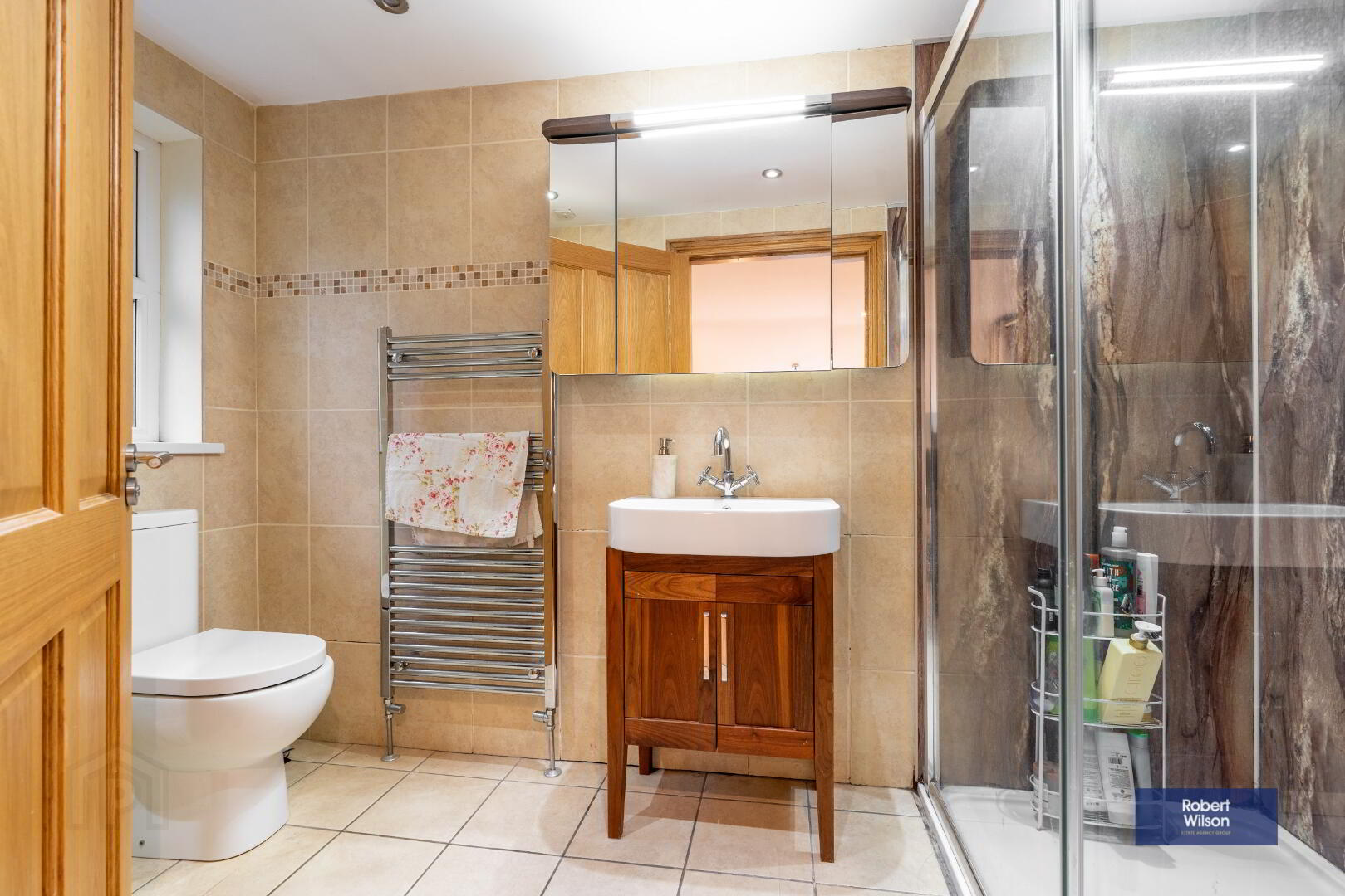 Large walk in double shower with thermostatic valve, double rainfall shower heads, vanity incorporated wash hand basin, low flush w.c., tiled walls, tiled floor, chrome heated towel rail, recessed lighting and extractor fan.