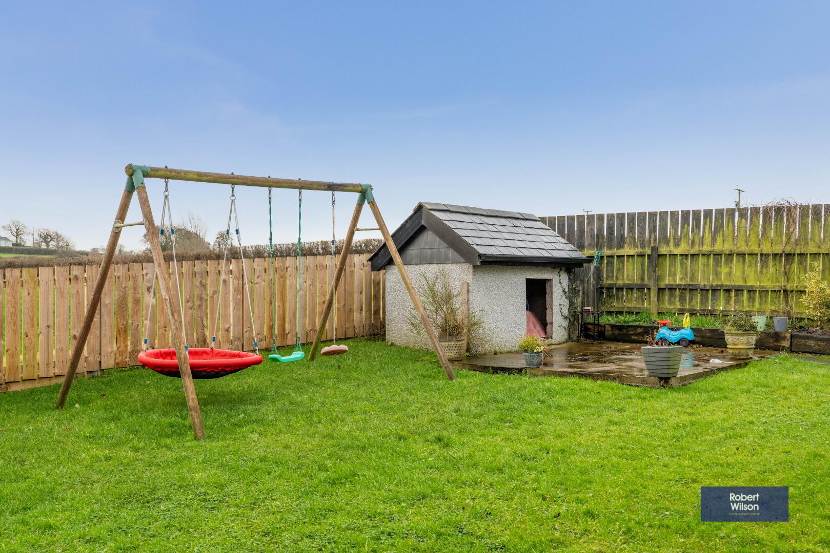 Fully enclosed rear garden, in lawn with patio area