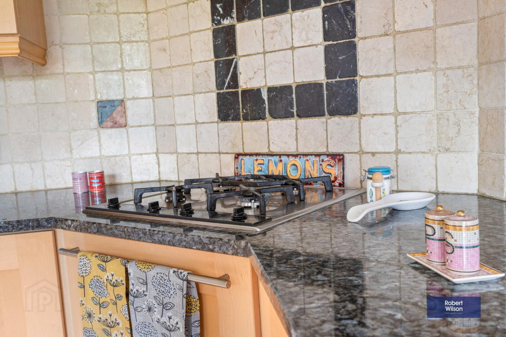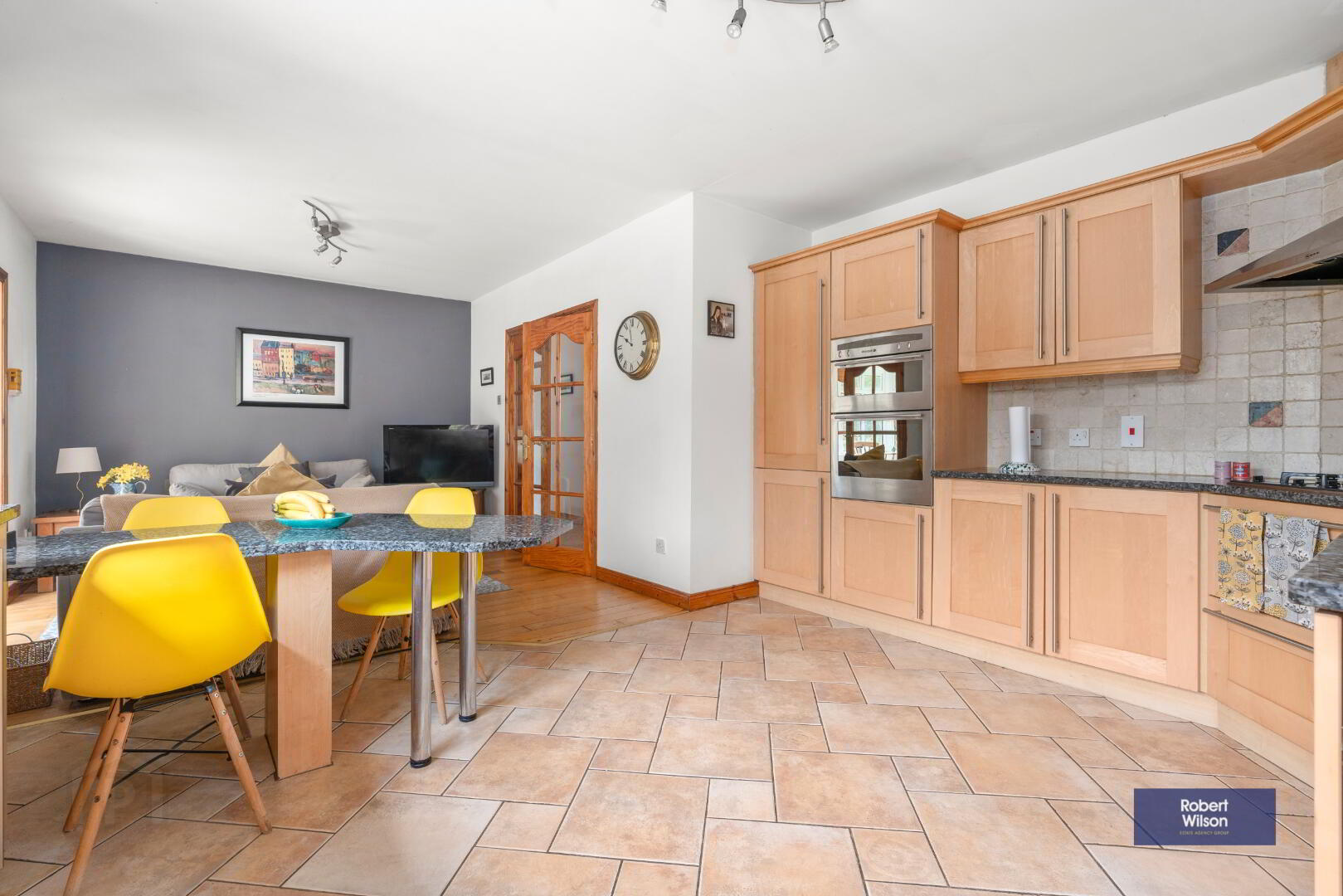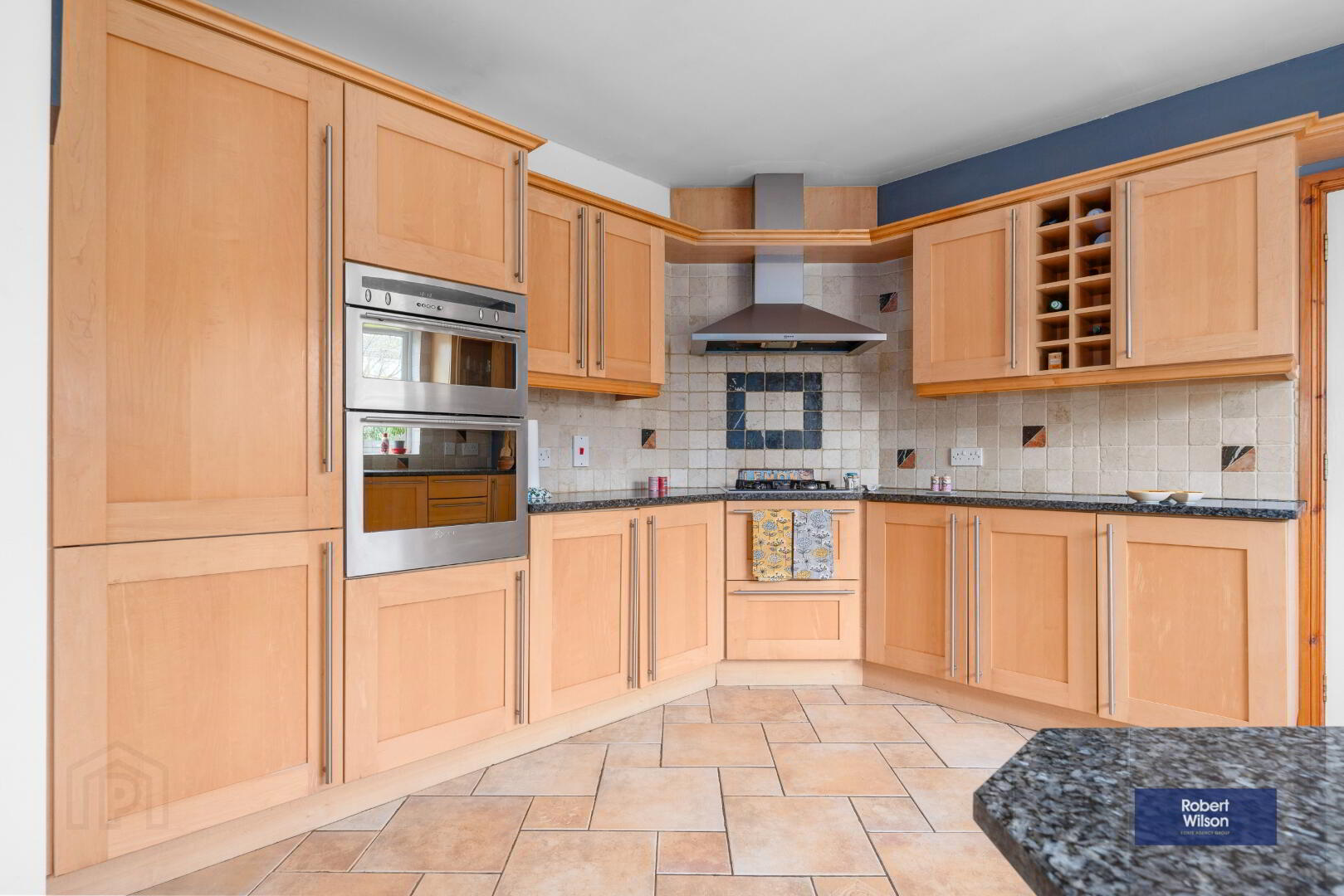 3.27m x 6.96m (10' 9" x 22' 10") Good range of high and low level units with granite worktop, 4 ring gas hob, eye level double oven, inset sink unit, integrated dishwasher, integrated fridge freezer, part tiled walls, tiled floor.