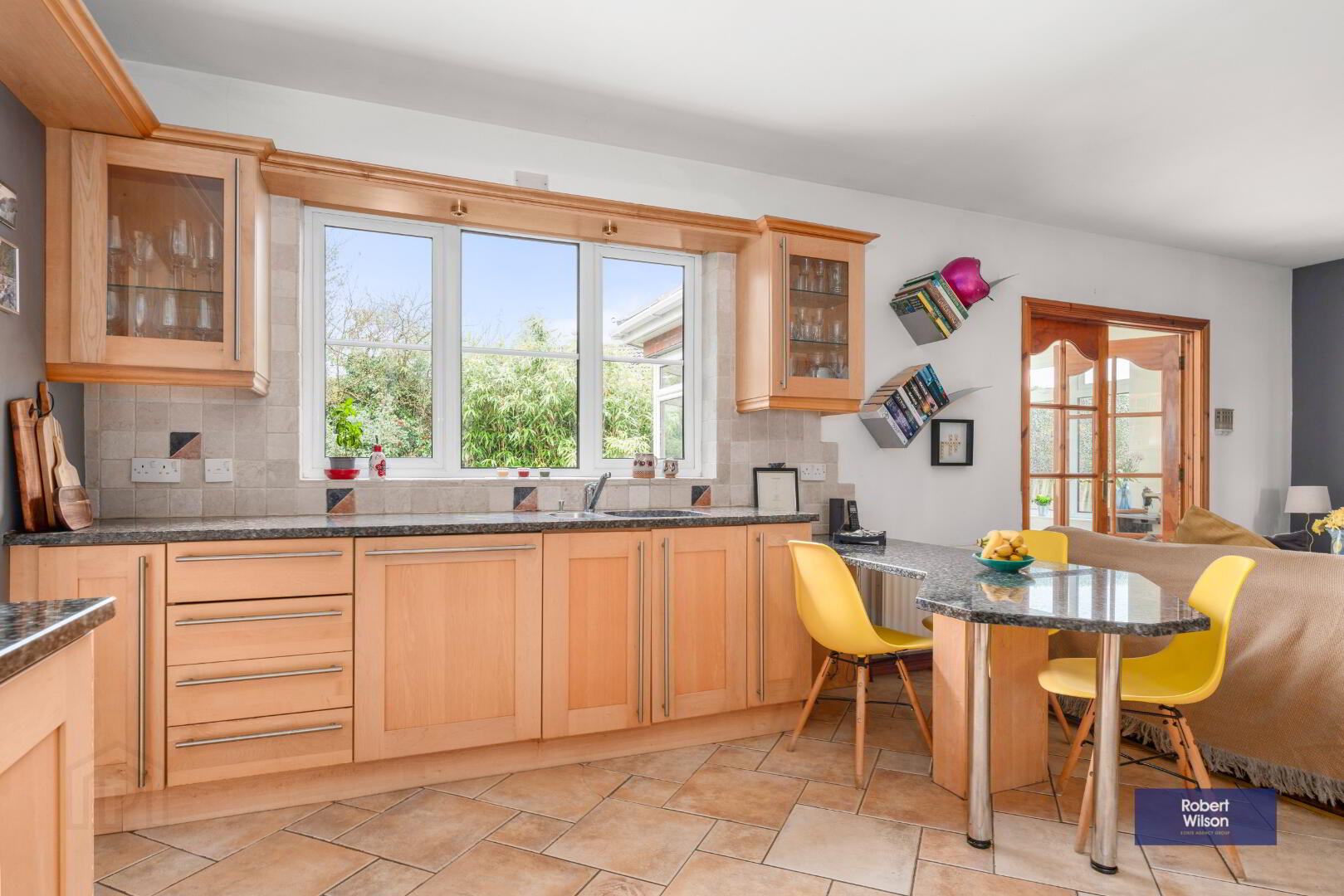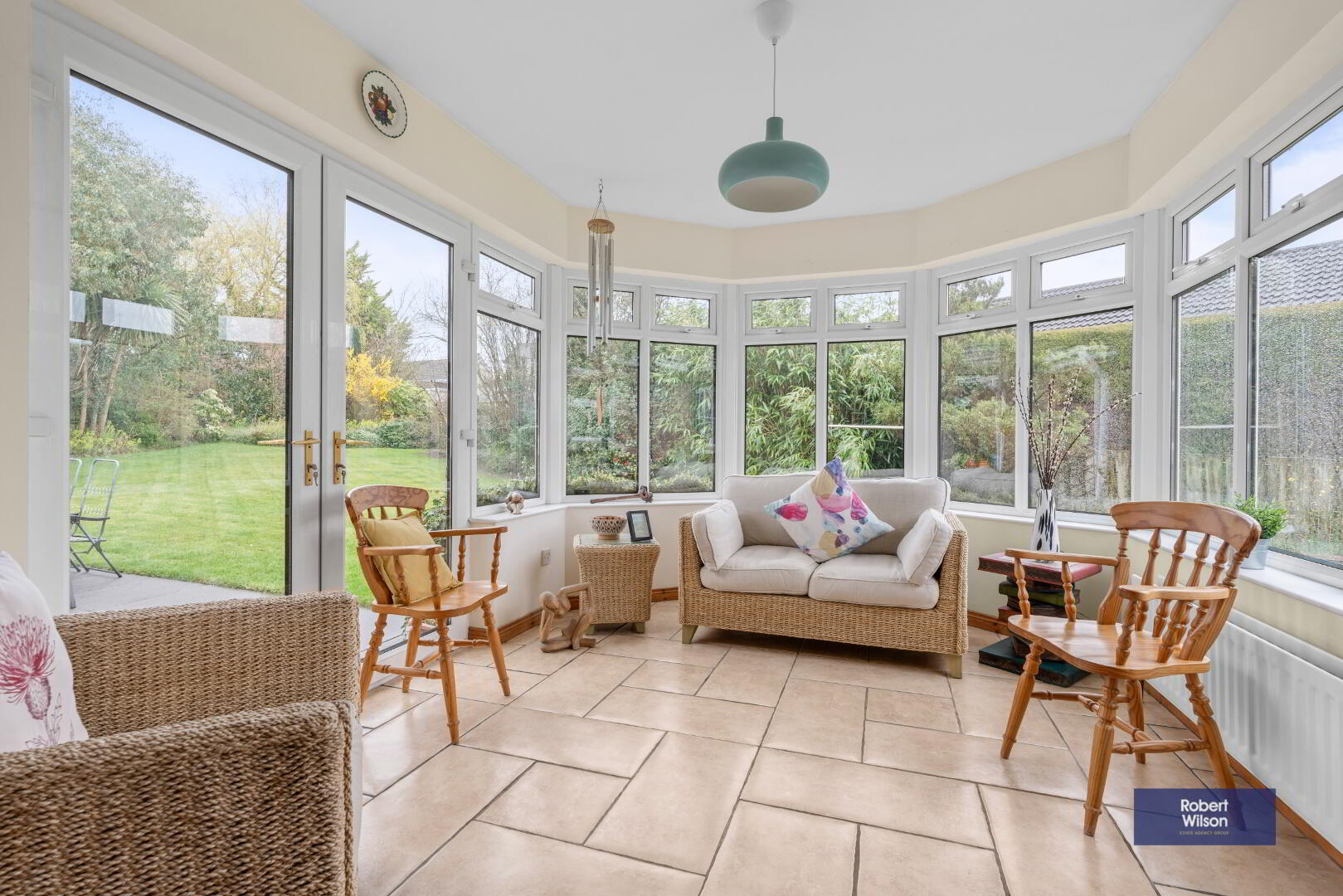 The kitchen/dining area is well-equipped with a range of high and low level units, granite worktops, integrated appliances, and tiled flooring, flowing seamlessly into a bright sunroom with French doors opening onto the rear patio - perfect for relaxing or entertaining. A separate utility room adds further practicality.