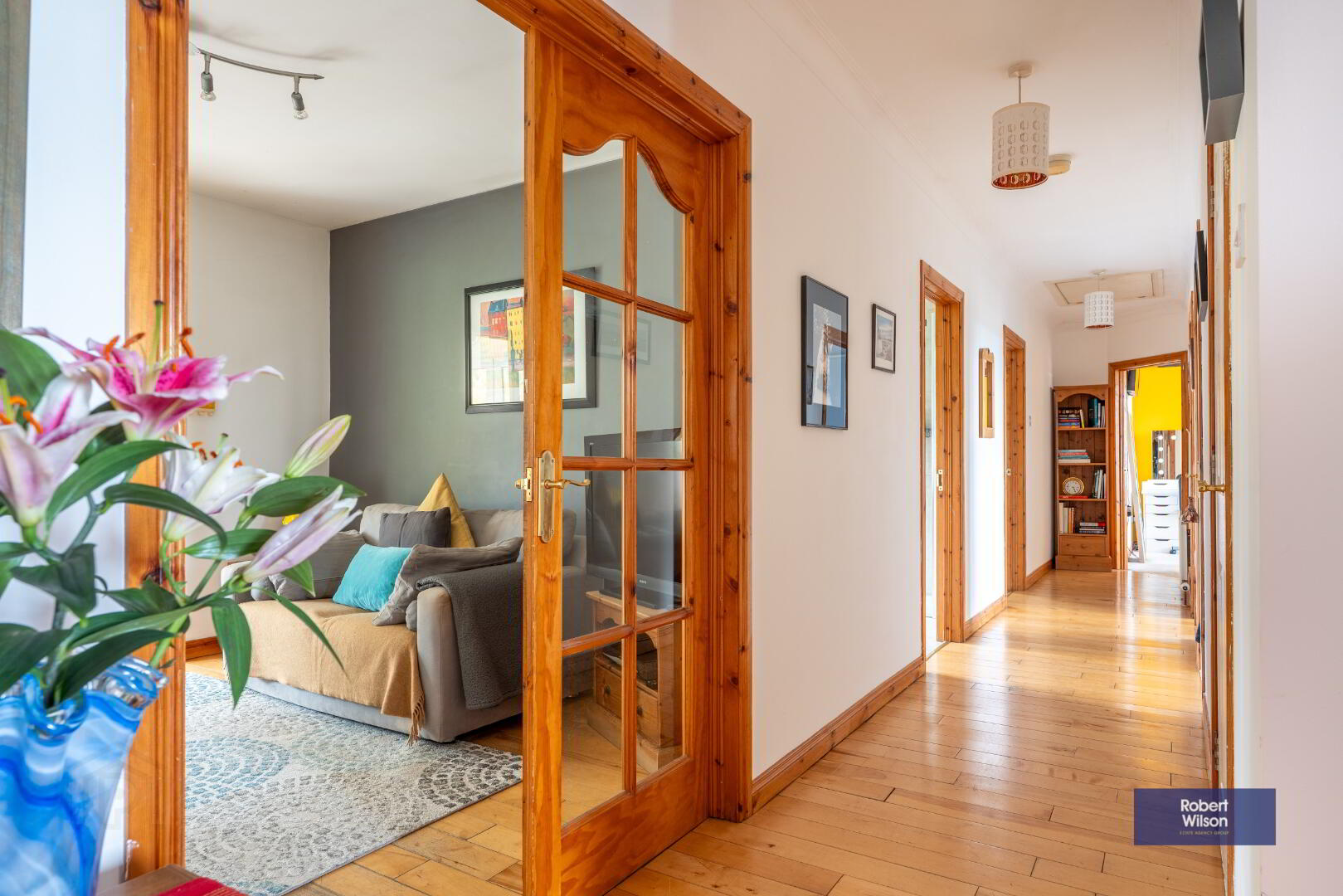 Hardwood front door with sidelight, solid wood floor, cloakroom off, hotpress off, single panel radiator, double panel radiator.