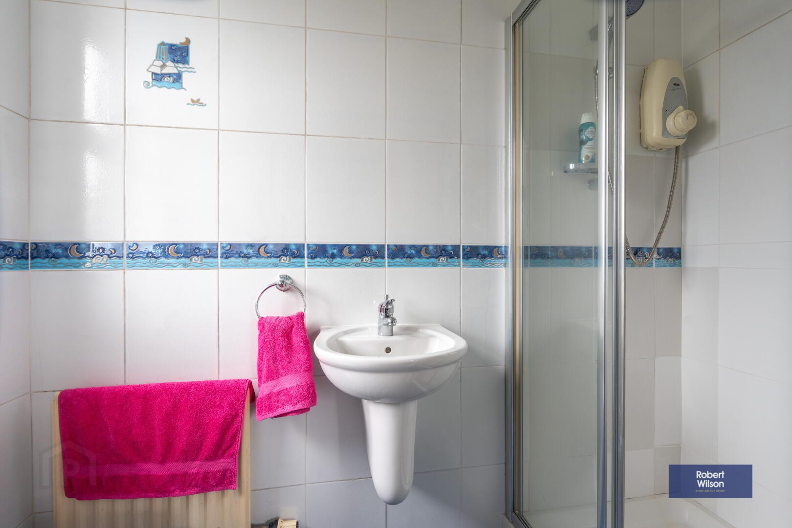 White suite comprising; wall mounted wash hand basin, large walk in shower, low flush w.c., single panel radiator, fully tiled walls, tiled floor.