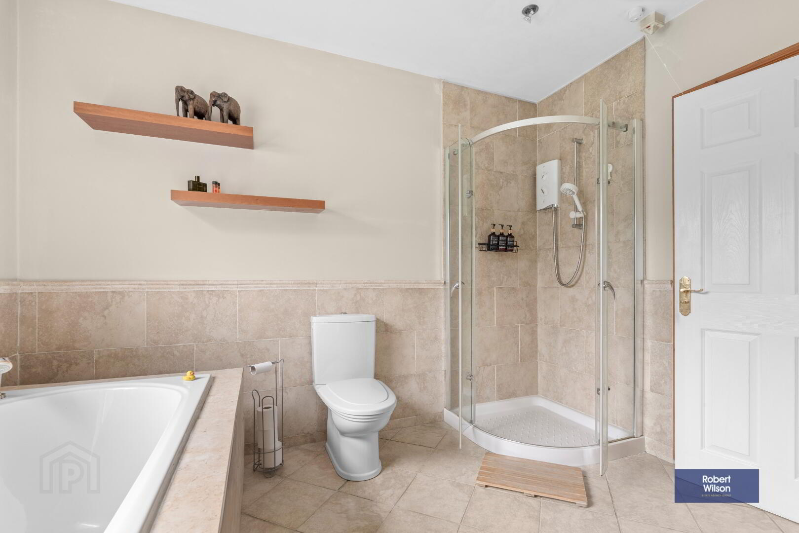 White suite comprising; low flush w.c., walk in shower cubicle, panel bath, wall mounted wash hand basin, part tiled walls, tiled floor, recessed lighting, extractor fan.