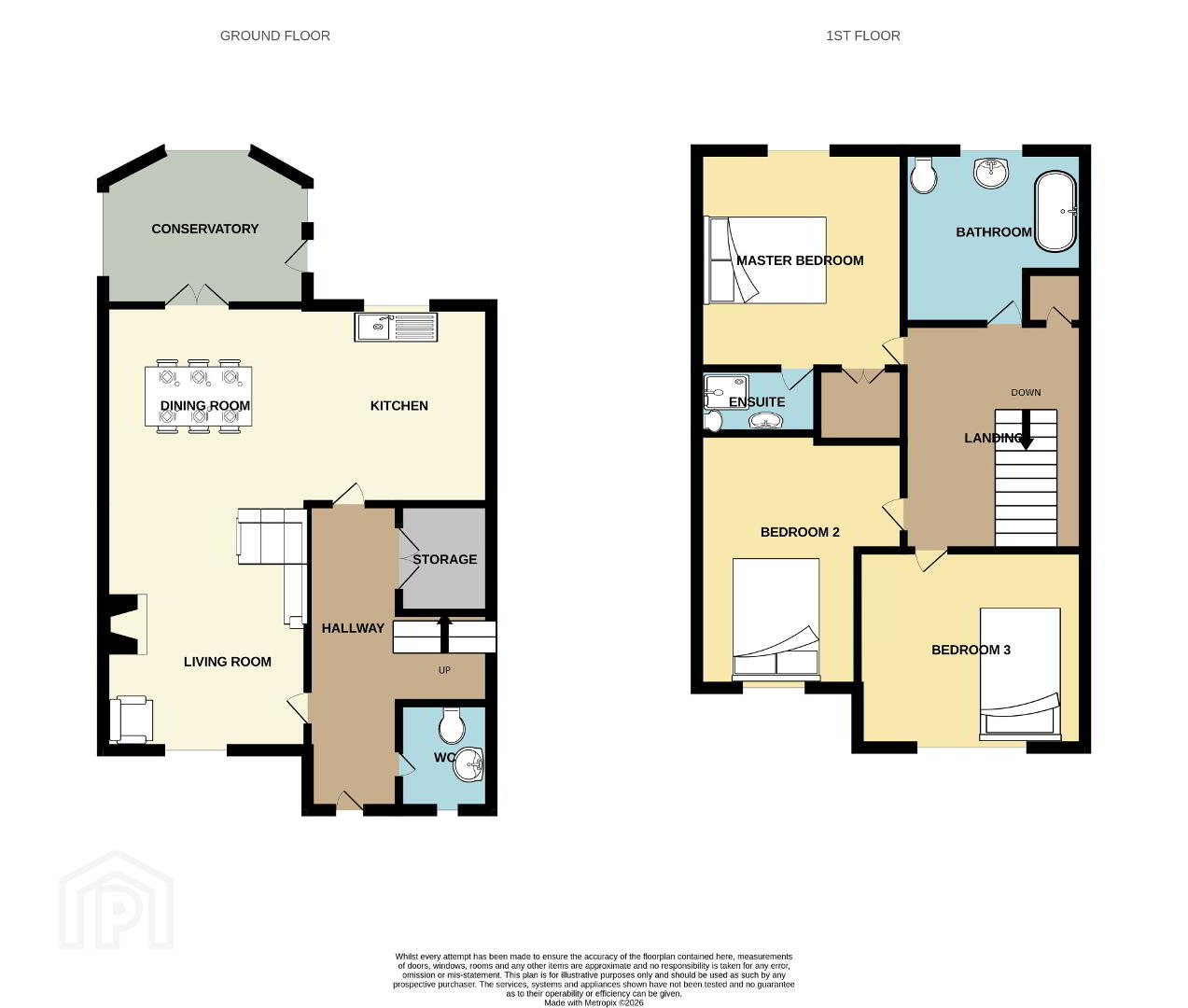 Upstairs, the property offers three well-proportioned bedrooms, with the master bedroom benefiting from an ensuite shower room. A family bathroom serves the remaining bedrooms, while a convenient downstairs WC adds to the practicality of the layout.