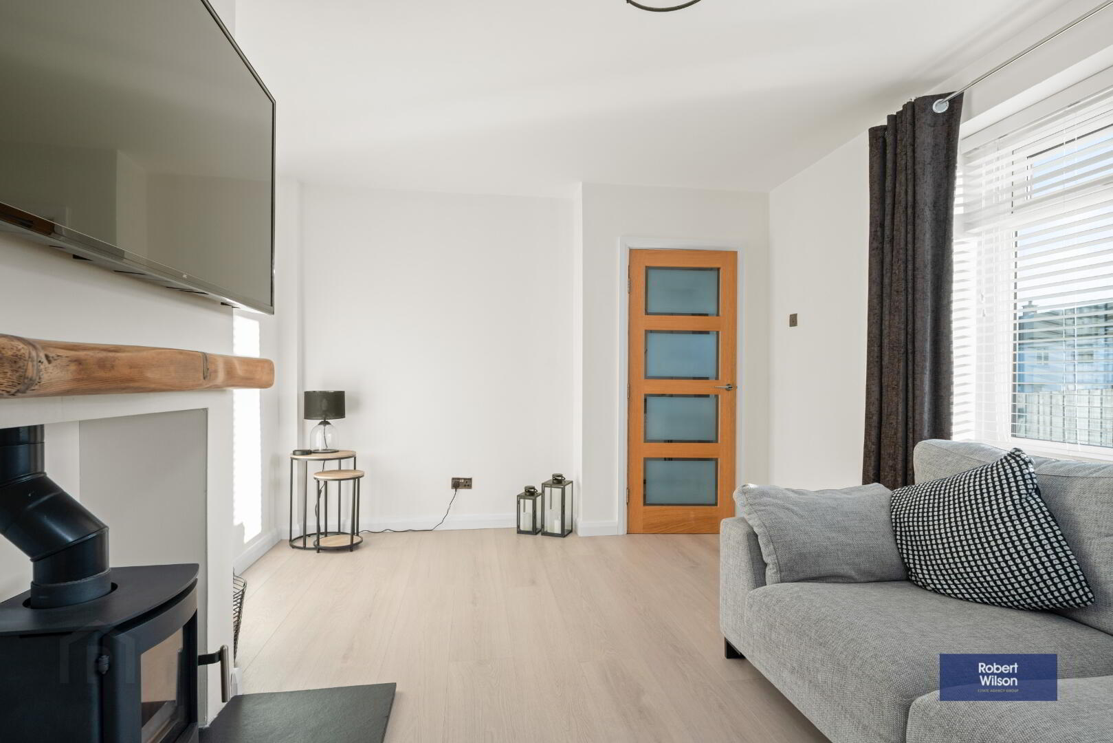 The ground floor comprises an entrance hall with composite front door and staircase to the first floor, leading to a bright and comfortable lounge with a feature fireplace with multi-fuel stove, slate hearth and sleeper mantle. To the rear, the contemporary kitchen/dining area is fitted with a range of high and low level units, built-in oven and ceramic hob, with recessed lighting, tiled flooring and French doors opening onto the rear garden—ideal for everyday living and entertaining.