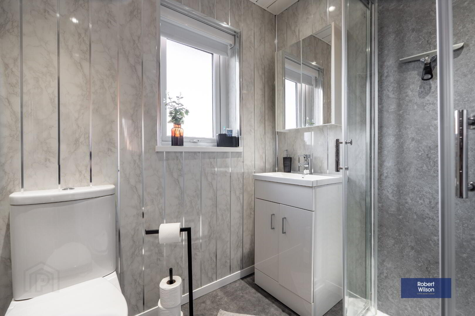 White suite comprising; low flush w.c., vanity incorporated wash hand basin, walk in shower cubicle with thermostatic valve, rainfall and handheld fittings, PVC wall panels and ceiling, recessed lighting and chrome heated towel rail.