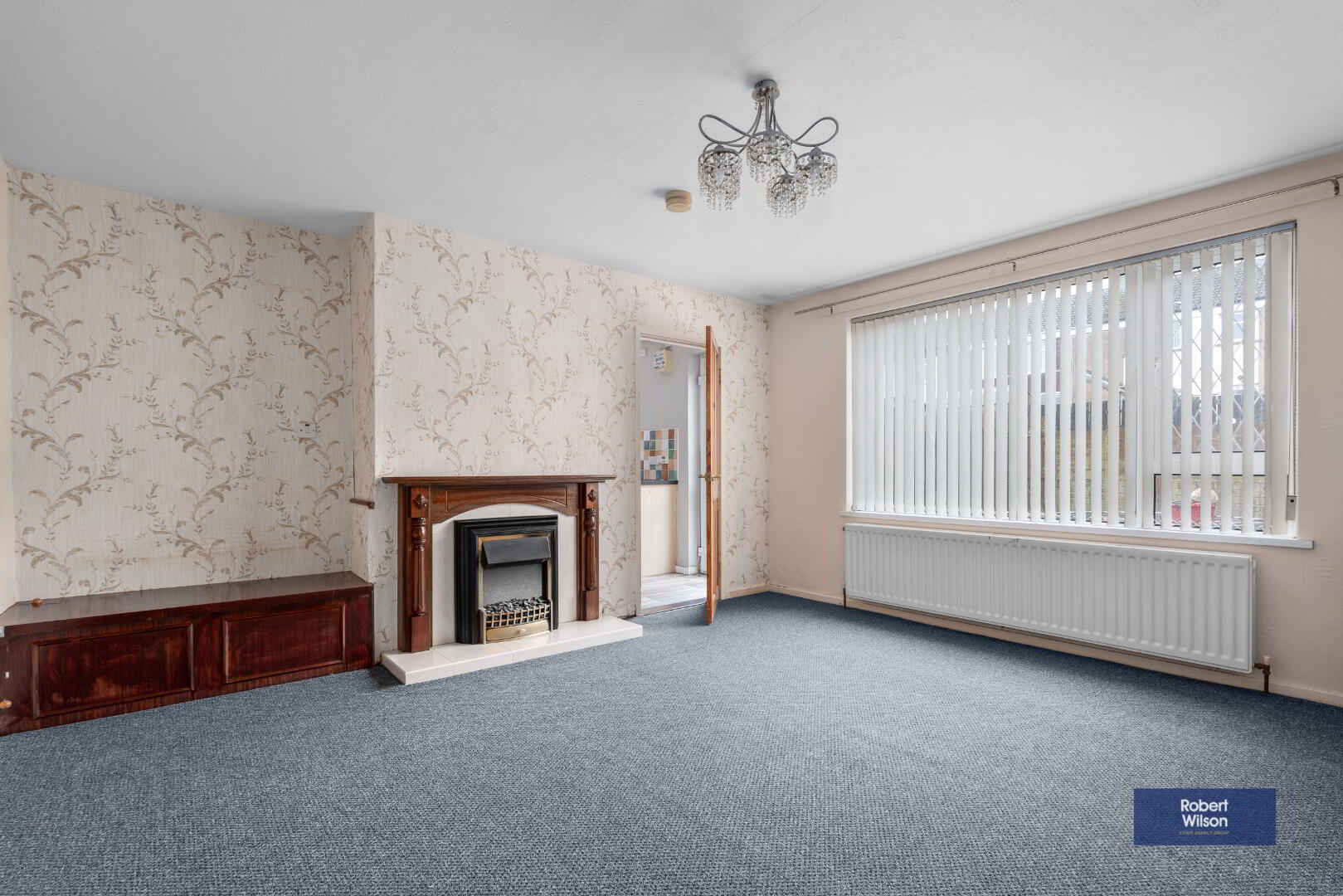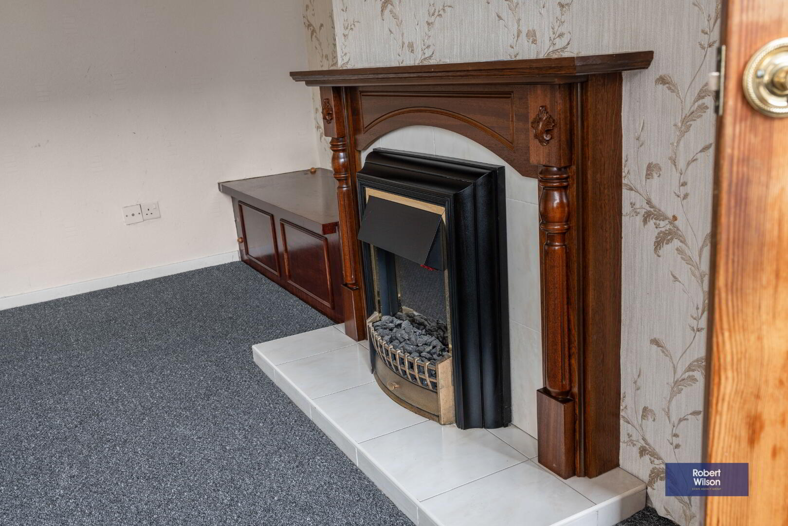 4.44m x 4.42m (14' 7" x 14' 6") Fireplace with Mahogany surround & mantle with electric fire inset on tiled hearth, double panel radiator, carpet flooring.