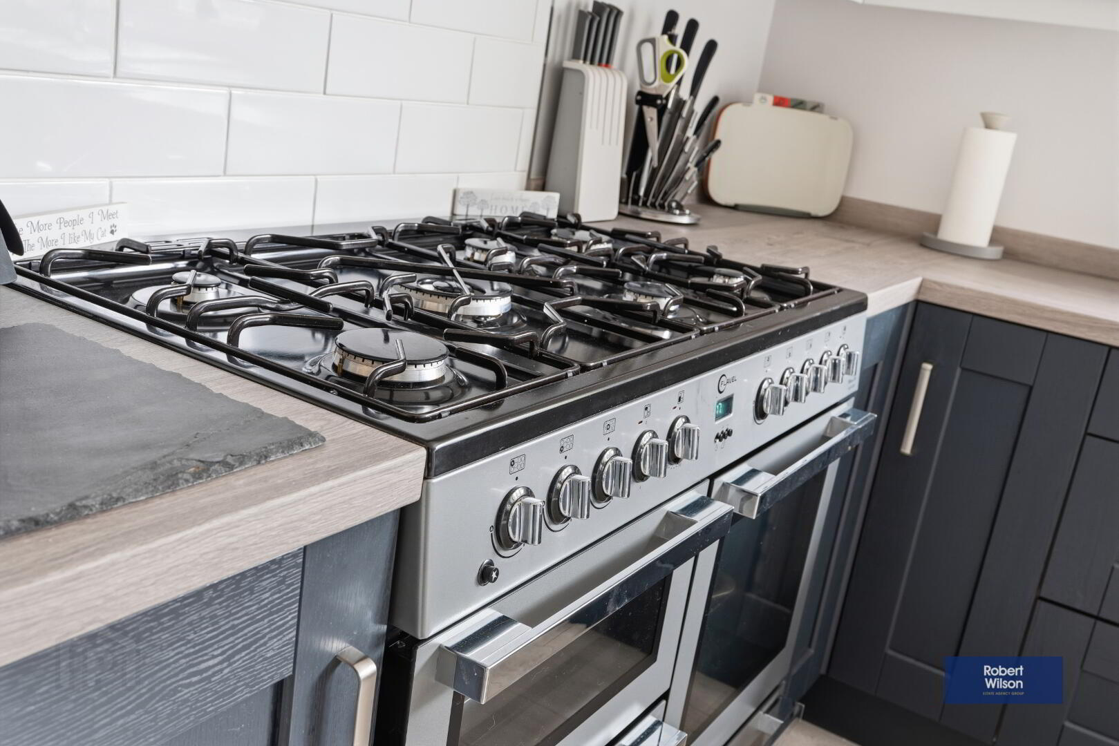 3.71m x 6.07m (12' 2" x 19' 11") Recently installed kitchen with extensive range of high & low level units. Base units in Indigo & wall units in light grey. Integrated dishwasher, space for fridge freezer & 7 ring stove with gas hob, stainless steel extractor fan over, 1.5 white ceramic sink unit with mixer tap, wood effect worktops & upstands, double panel radiator, 1/2 glazed uPVC door to rear.