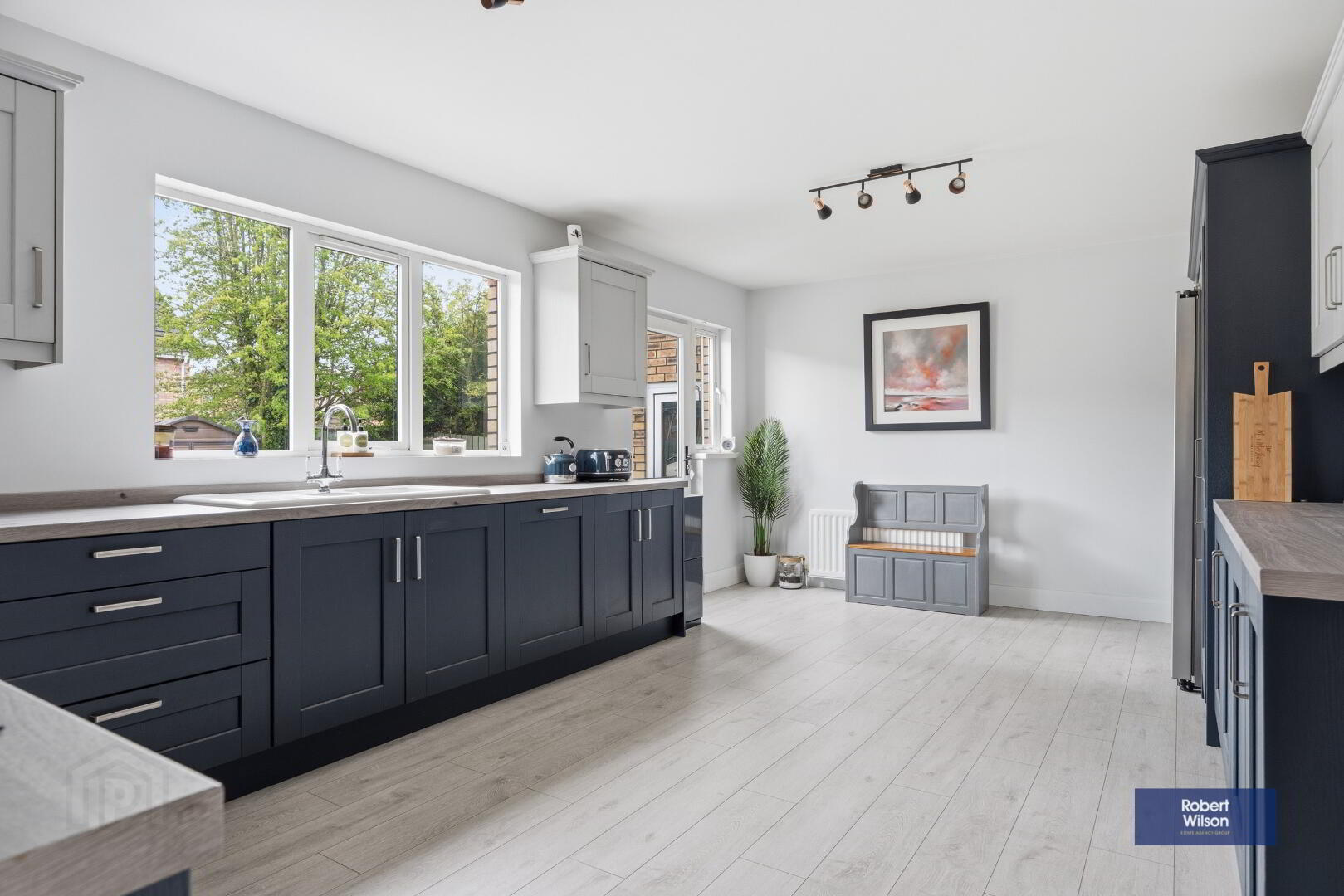 The property further benefits from a separate dining area and a recently installed, contemporary kitchen finished with stylish Indigo blue base units and light grey wall units, offering both practicality and modern appeal.