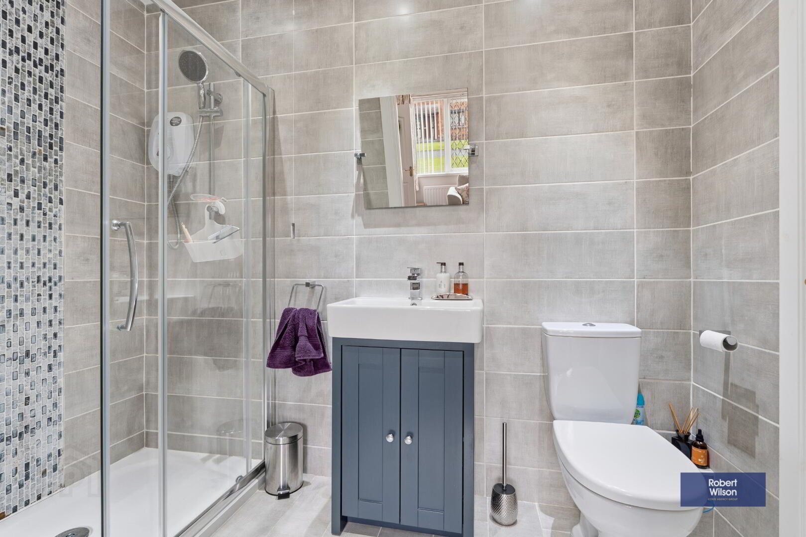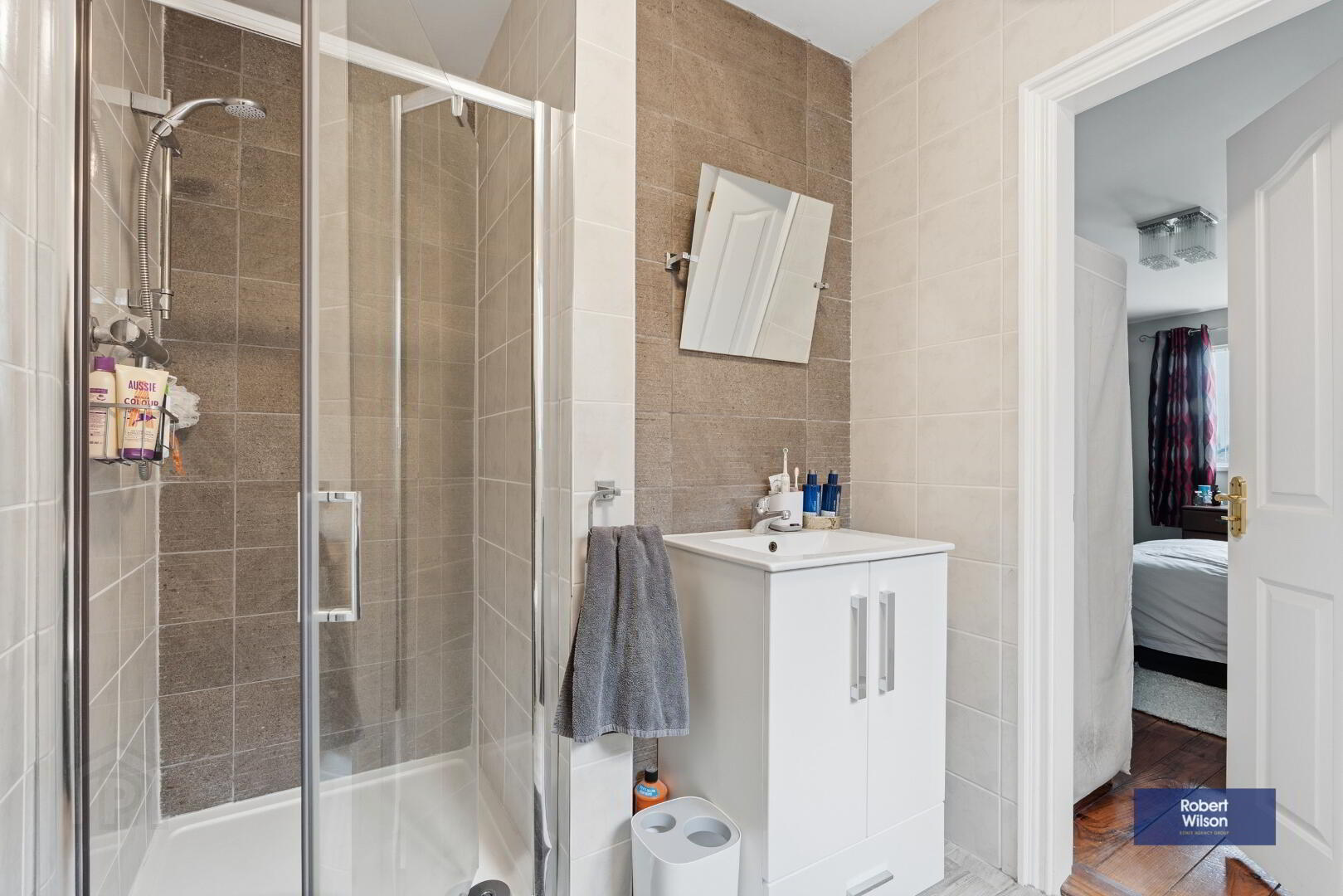 1.92m x 1.75m (6' 4" x 5' 9") 3 piece white suite comprising, low flush WC, vanity unit incorporating wash hand basin, walk in shower cubicle with thermostatic shower unit, fully tiled walls & floor, chrome heated towel rail, extractor fan.