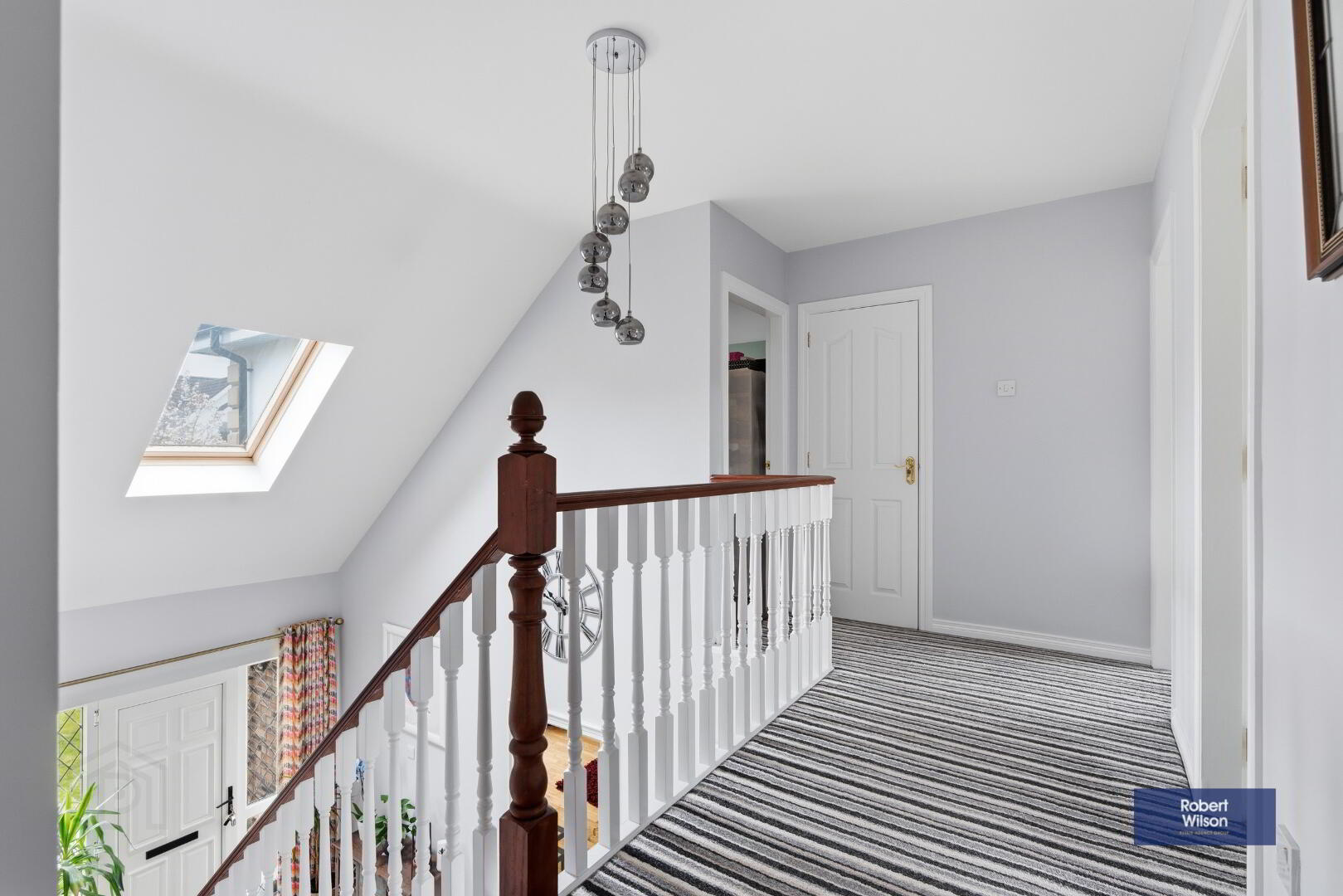 Balcony style landing with Velux window, hot press with shelving, access to partially floored loft via pull down ladder.