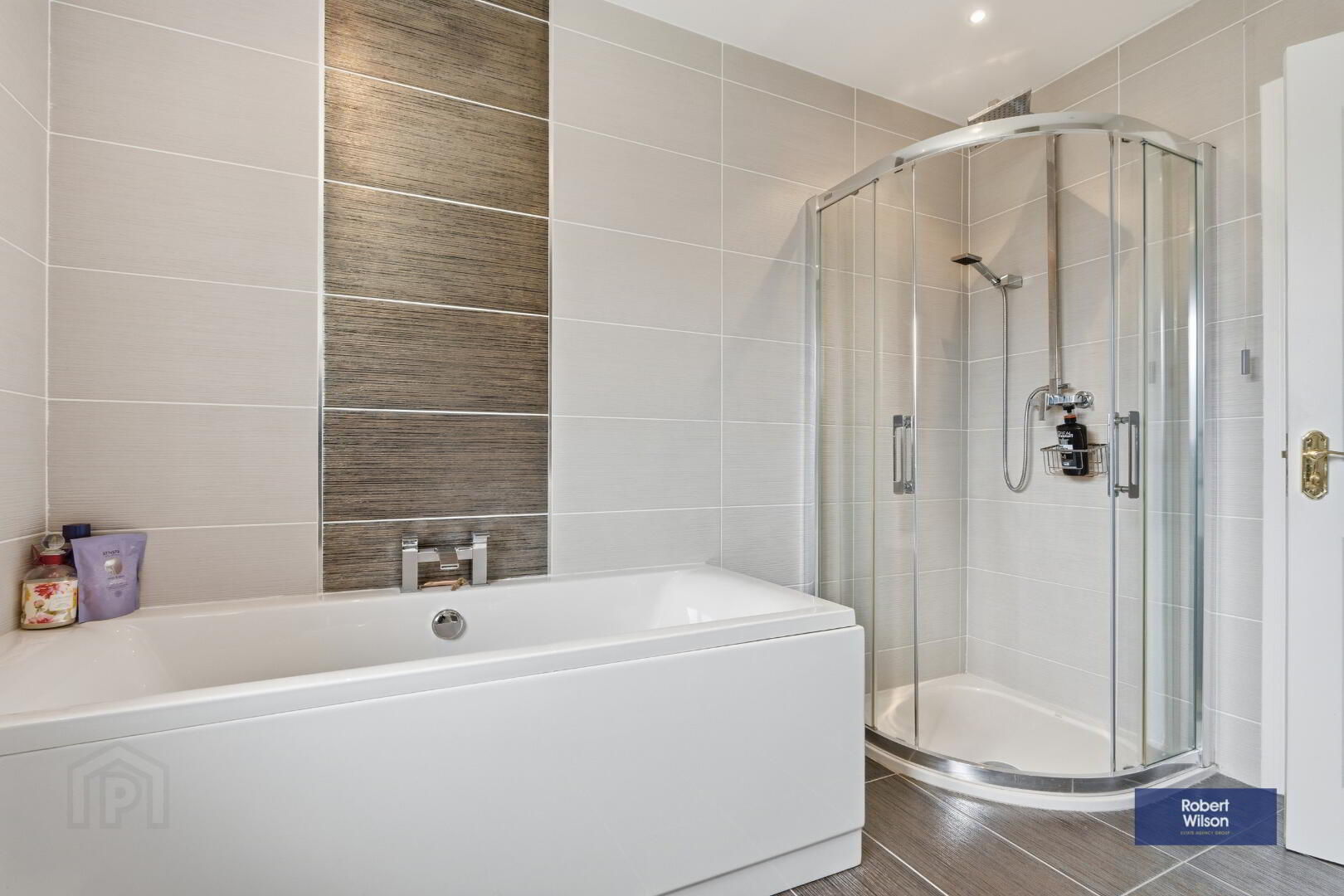 2.99m x 1.66m (9' 10" x 5' 5") 4 piece white suite comprising, low flush WC, vanity unit incorporating wash hand basin with vanity mirror over, panel bath, walk in shower cubicle with rain fall shower unit, chrome heated towel rail, recessed lights, fully tiled walls & floor, extractor fan.