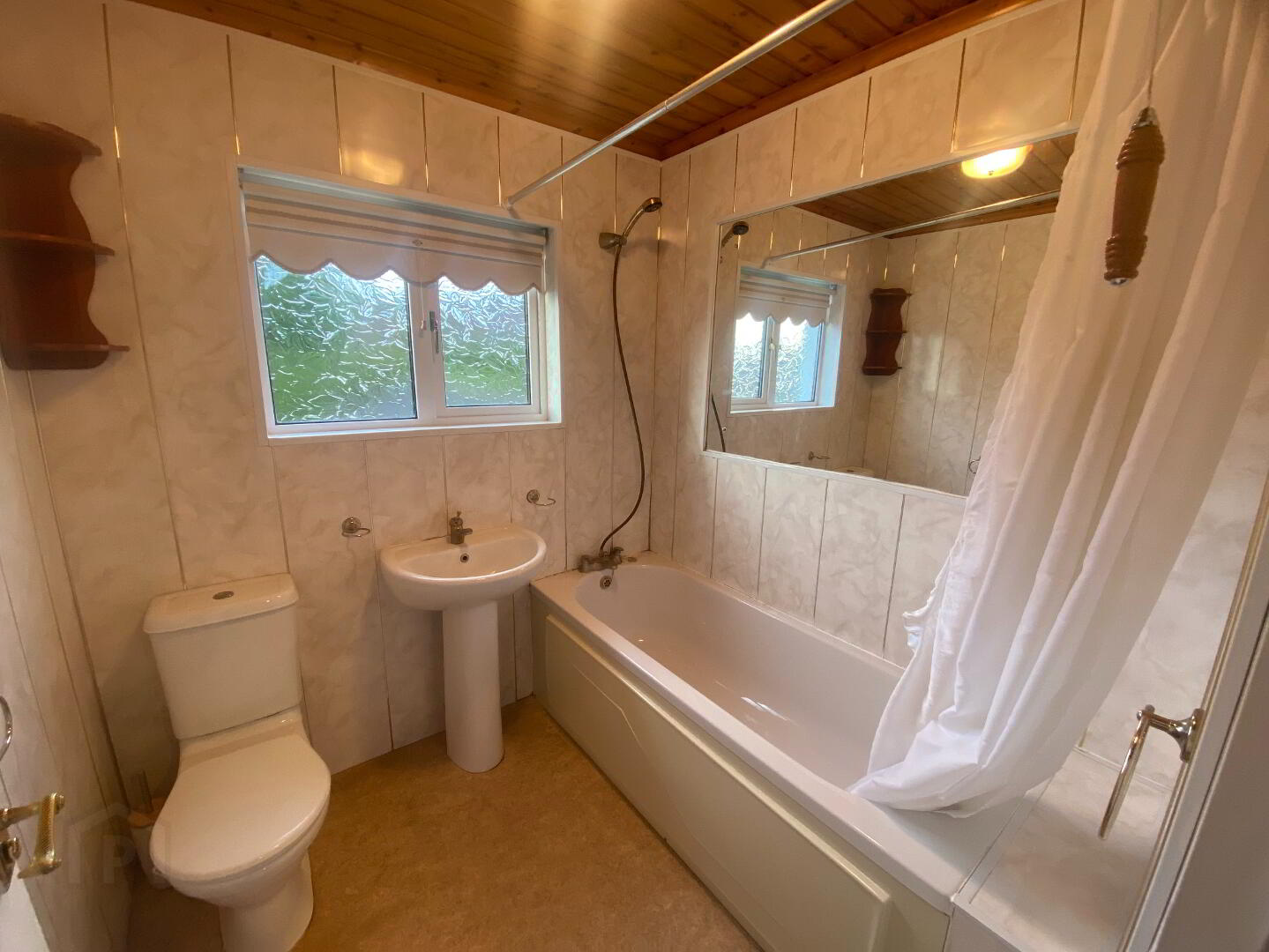 2.00m x 1.89m (6' 7" x 6' 2") 3 piece white suite comprising low flush WC, pedestal wash hand basin, panel bath with shower attachment over, PVC walls, tongue & groove ceiling, single panel radiator vinyl flooring.