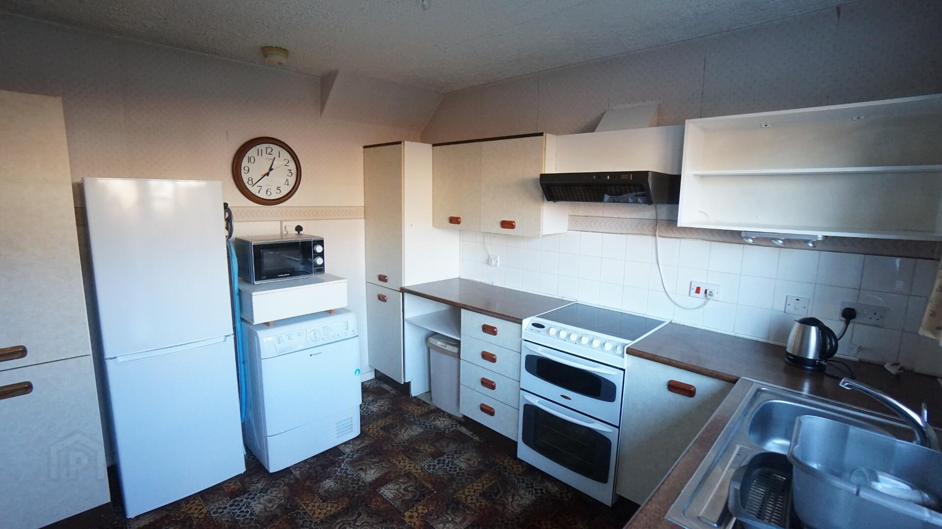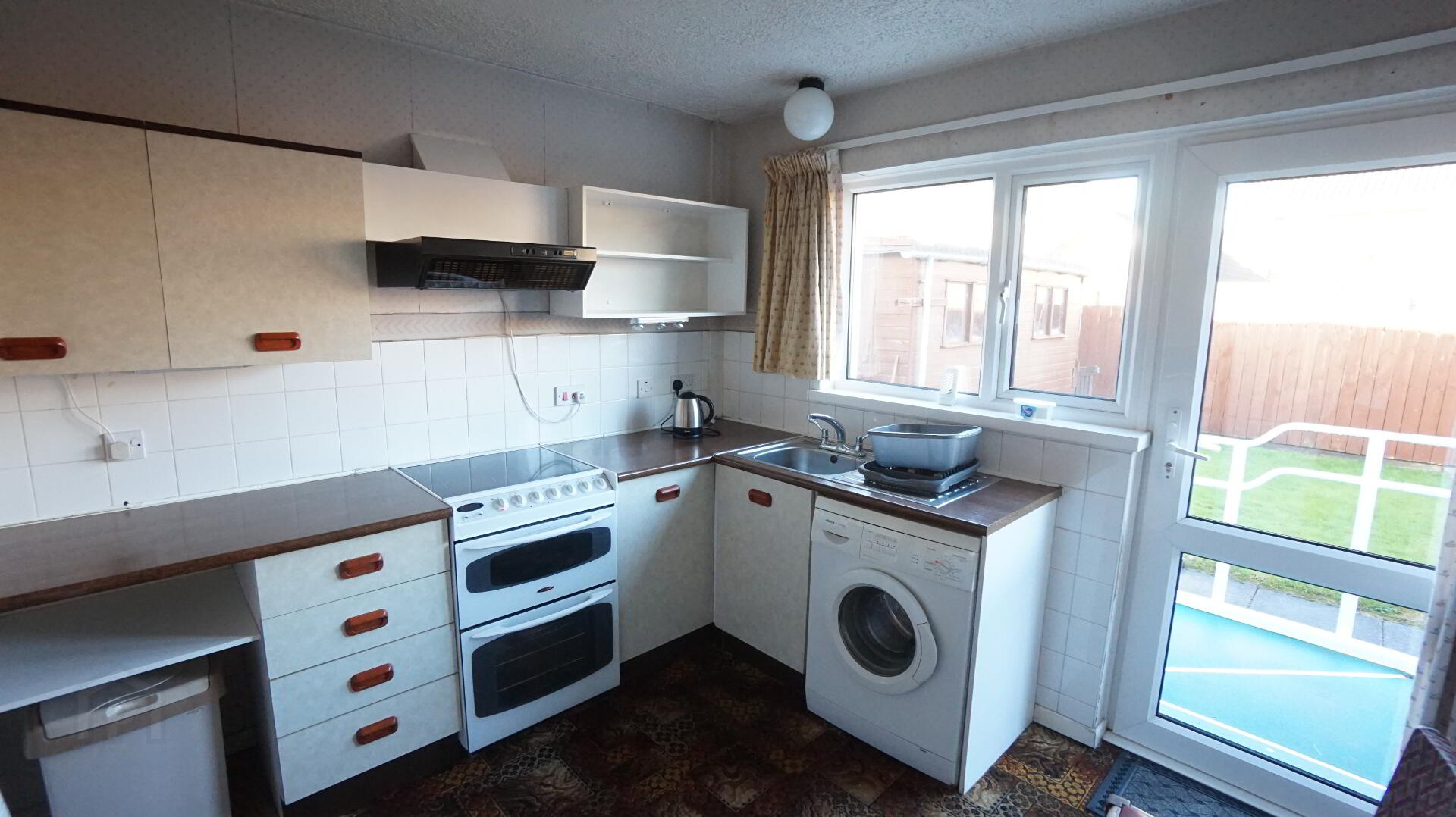 Fitted kitchen with range of high and low level units, stainless steel sink unit, space for washing machine and tumble dryer, stand alone oven with extractor fan over, part tiled walls, laminate worktops, PVC door with glazing to rear.