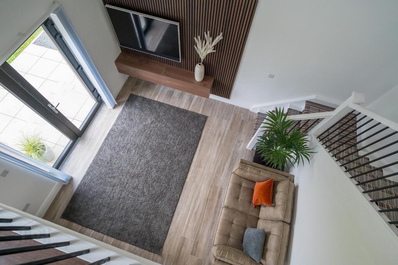 4.8m x 4.75m (15' 9" x 15' 7") Lounge-Staircase to first floor, porcelain tiled floor, vertical wood panelling detail, French doors to rear garden