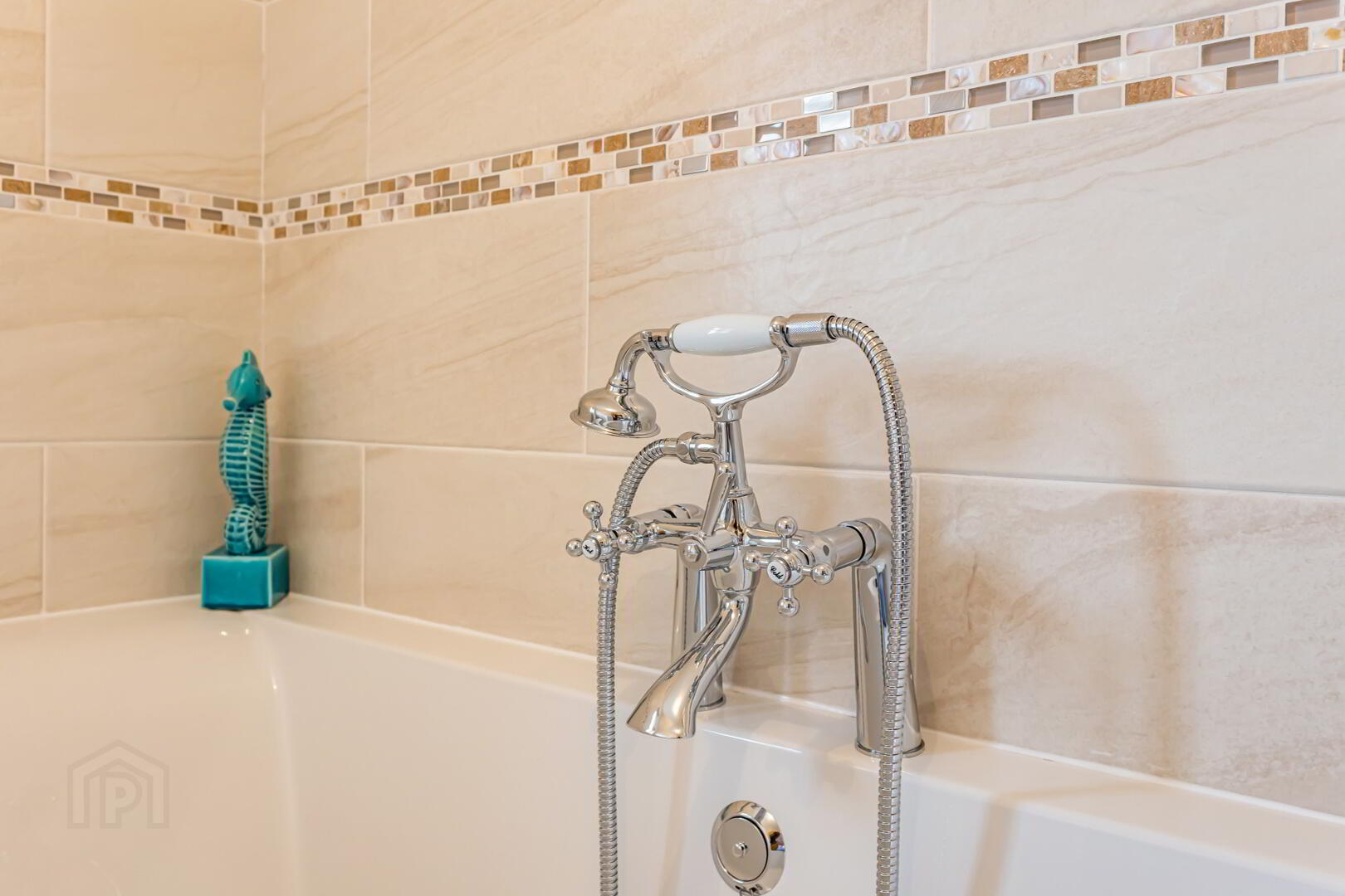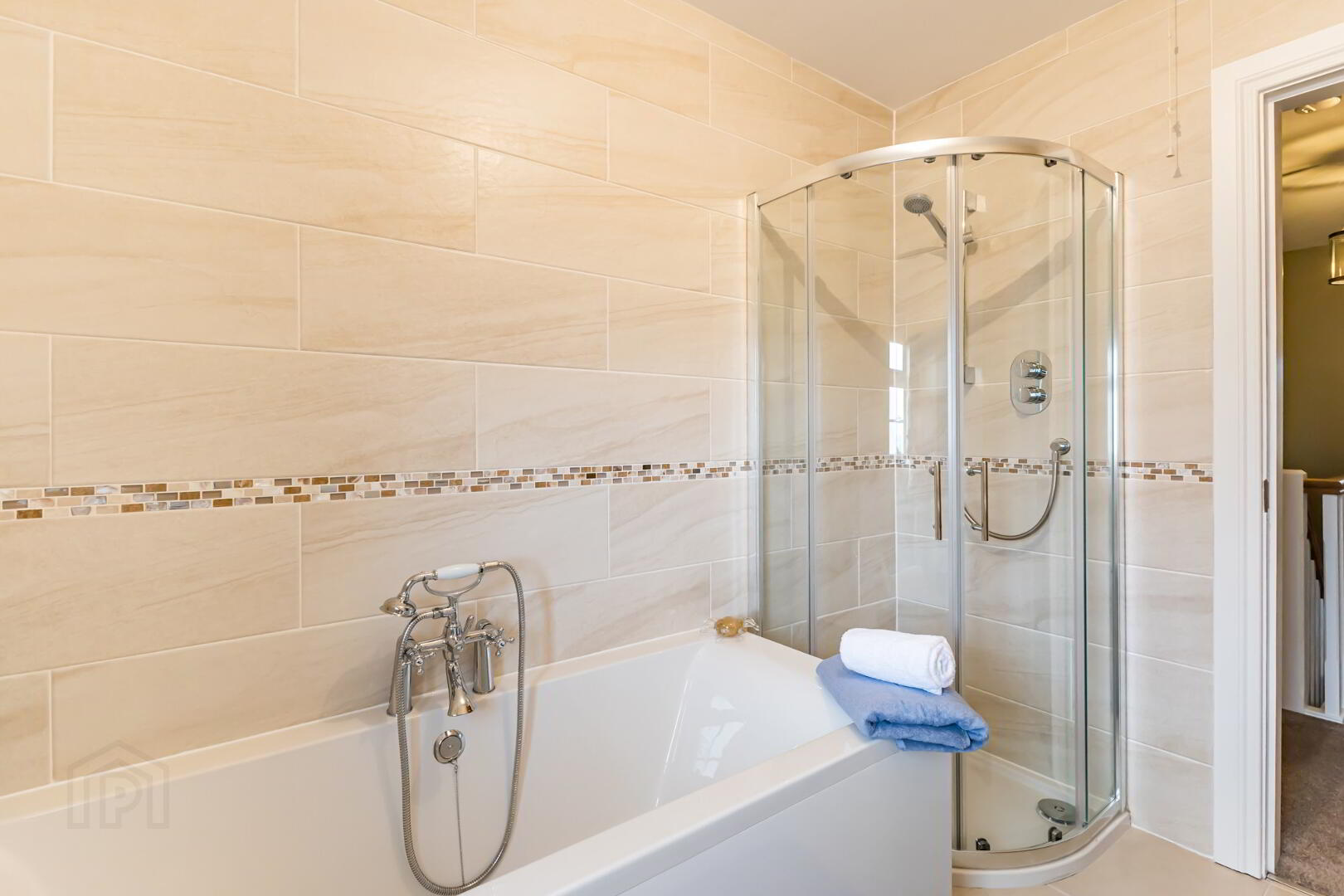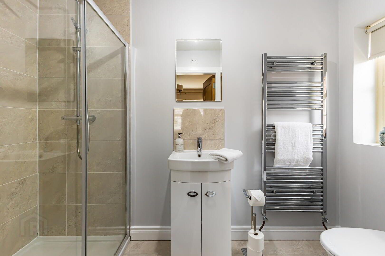 White suite comprising; low flush wc, vanity incorporated wash hand basin, large walk in shower with thermostatic vale, rainfall and handheld heads, chrome heated towel rail, part tiled walls, tiled floor, extractor fan.