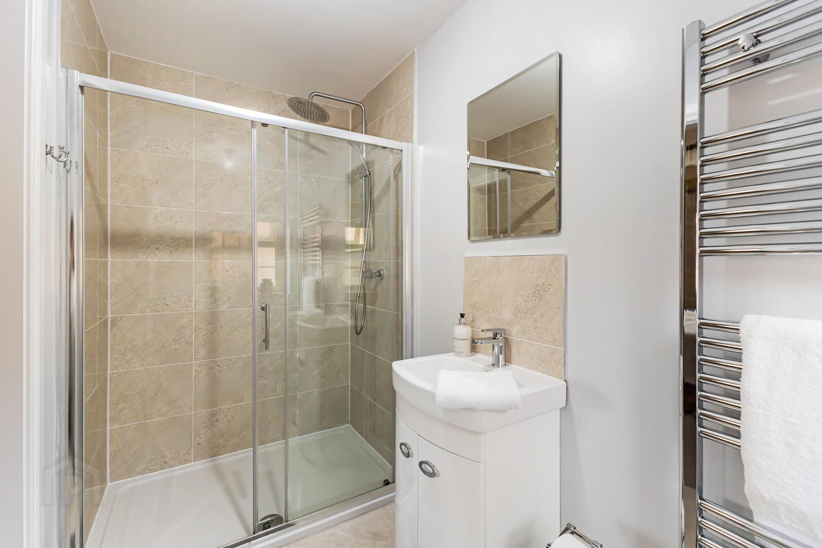 2.57m x 2.01m (8' 5" x 6' 7") White suite comprising; low flush wc, vanity incorporated wash hand basin with mixer tap, large walk in shower cubicle with thermostatic valve with rainfall and handheld heads, chrome heated towel rail, part tiled walls, tiled floor and extractor fan.