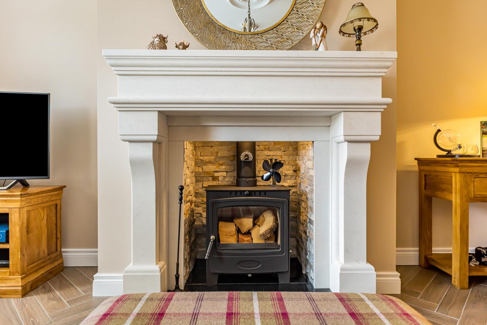 The ground floor welcomes you with a bright entrance hall featuring porcelain tiled flooring and useful under-stair storage. The spacious lounge boasts a beautiful granite fireplace with multi-fuel stove, cornicing, ceiling rose, and wood-effect porcelain floor tiles—creating a warm and inviting space for relaxing.