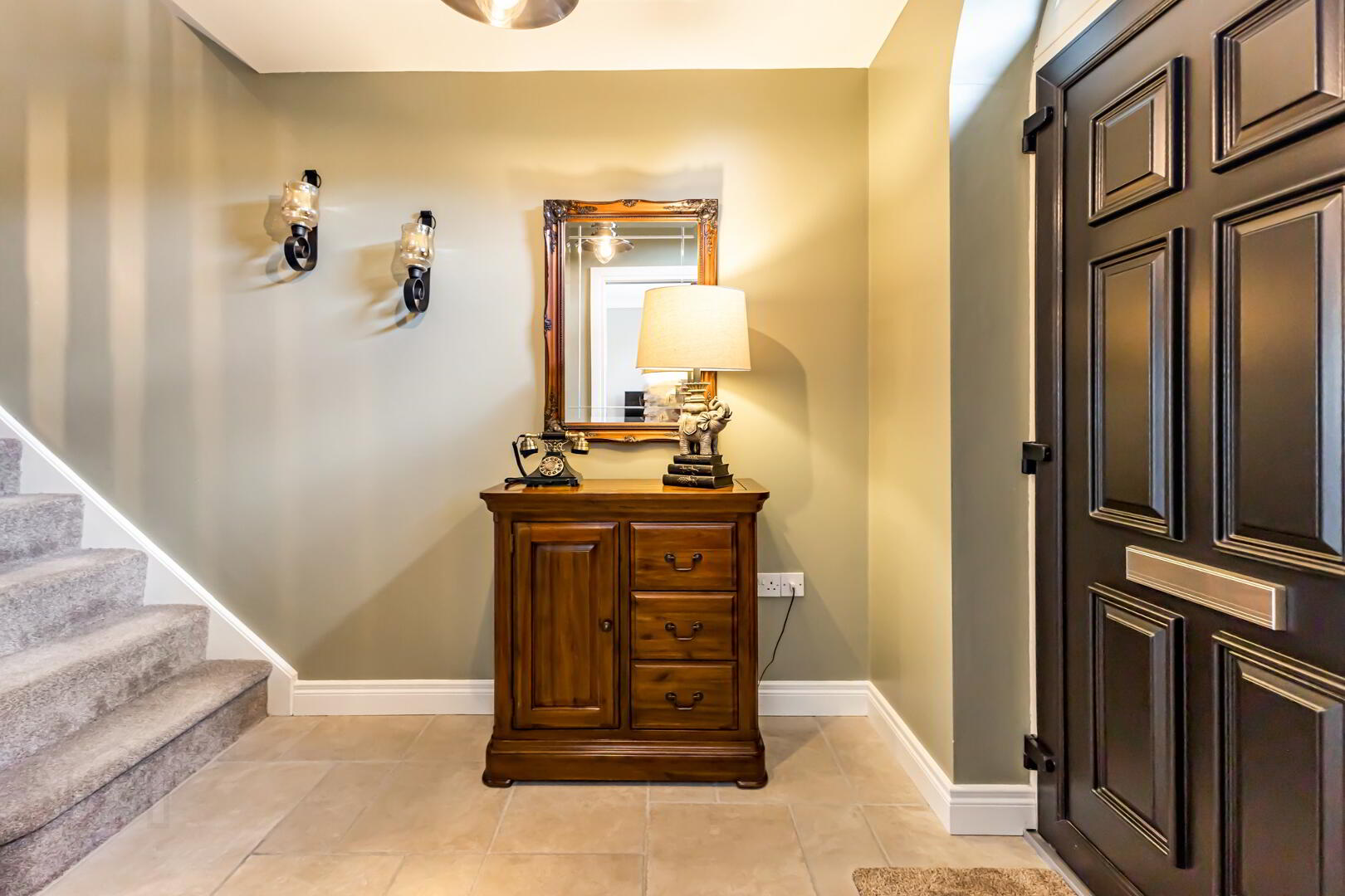 Composite front door with fan light, staircase to first floor, storage cupboard off with light, porcelian tiled floor, double panel radiator.