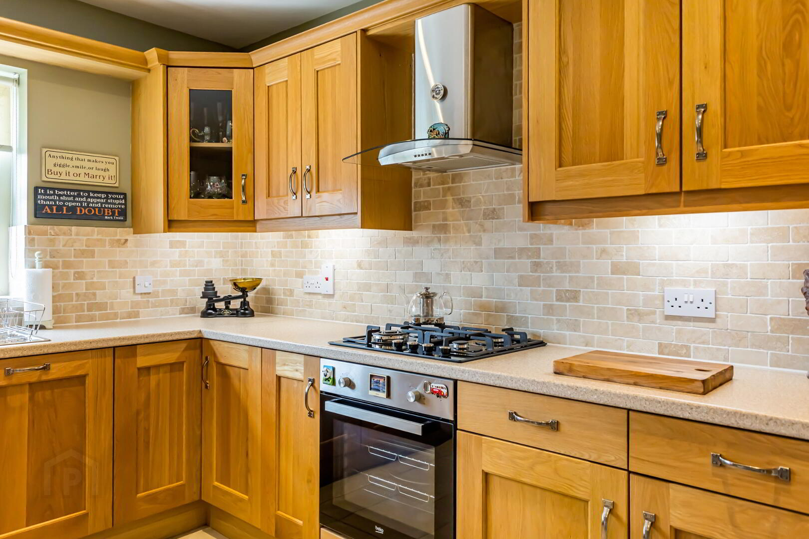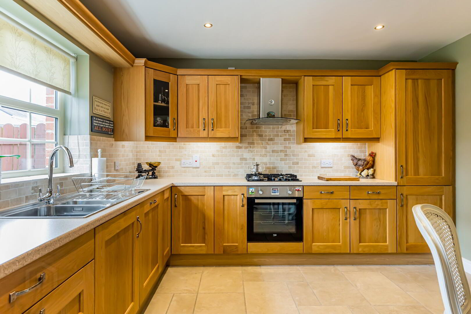 3.64m x 3.92m (11' 11" x 12' 10") Solid oak kitchen with good range of high and low level units, laminate worktops, 1 & 1/2 stainless steel sink unit with mixer tap, integrated dishwasher, integrated fridge freezer, single oven with 4 ring gas hob and extractor over, part tiled walls, tiled floor, recessed lighting, double panel radiator.