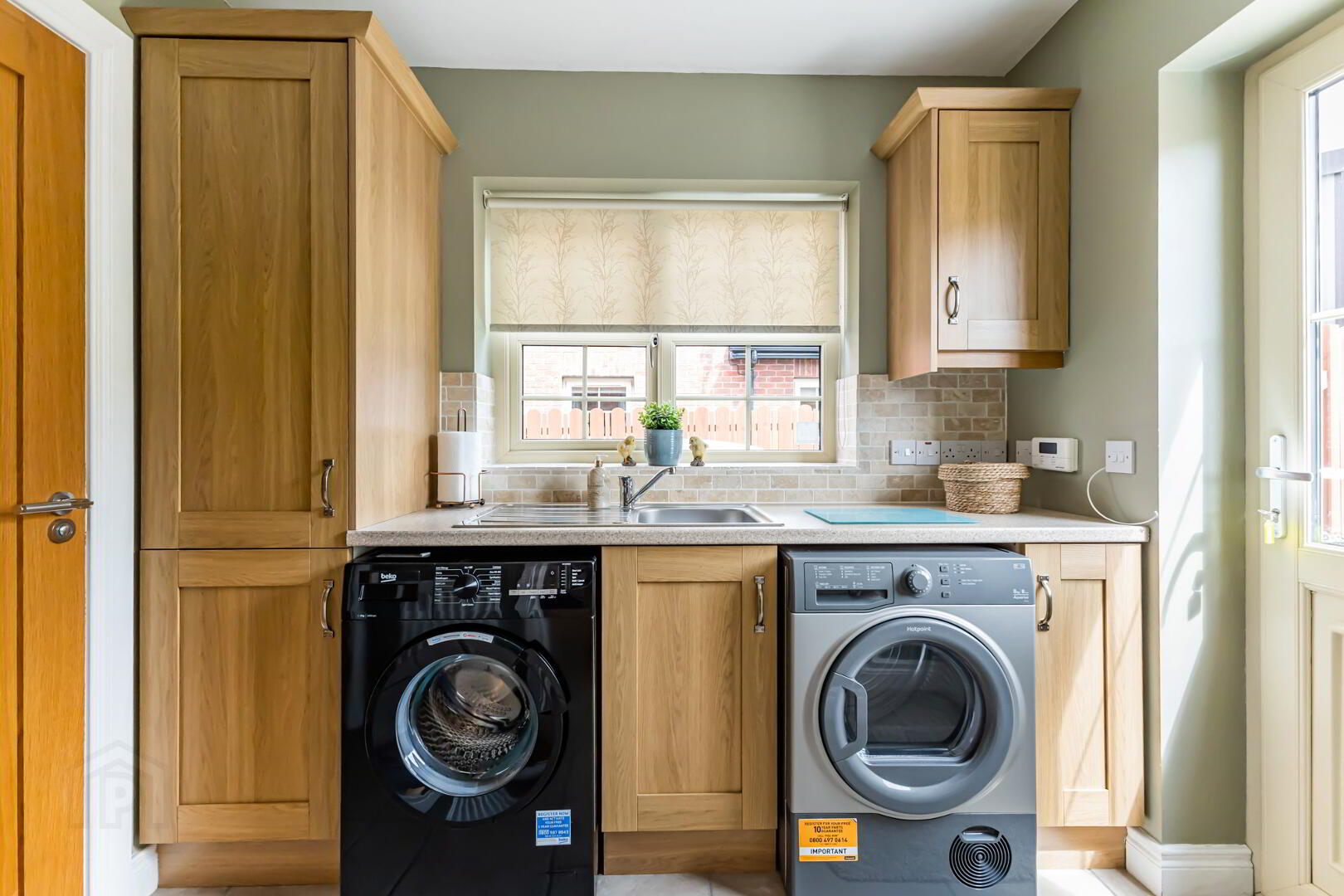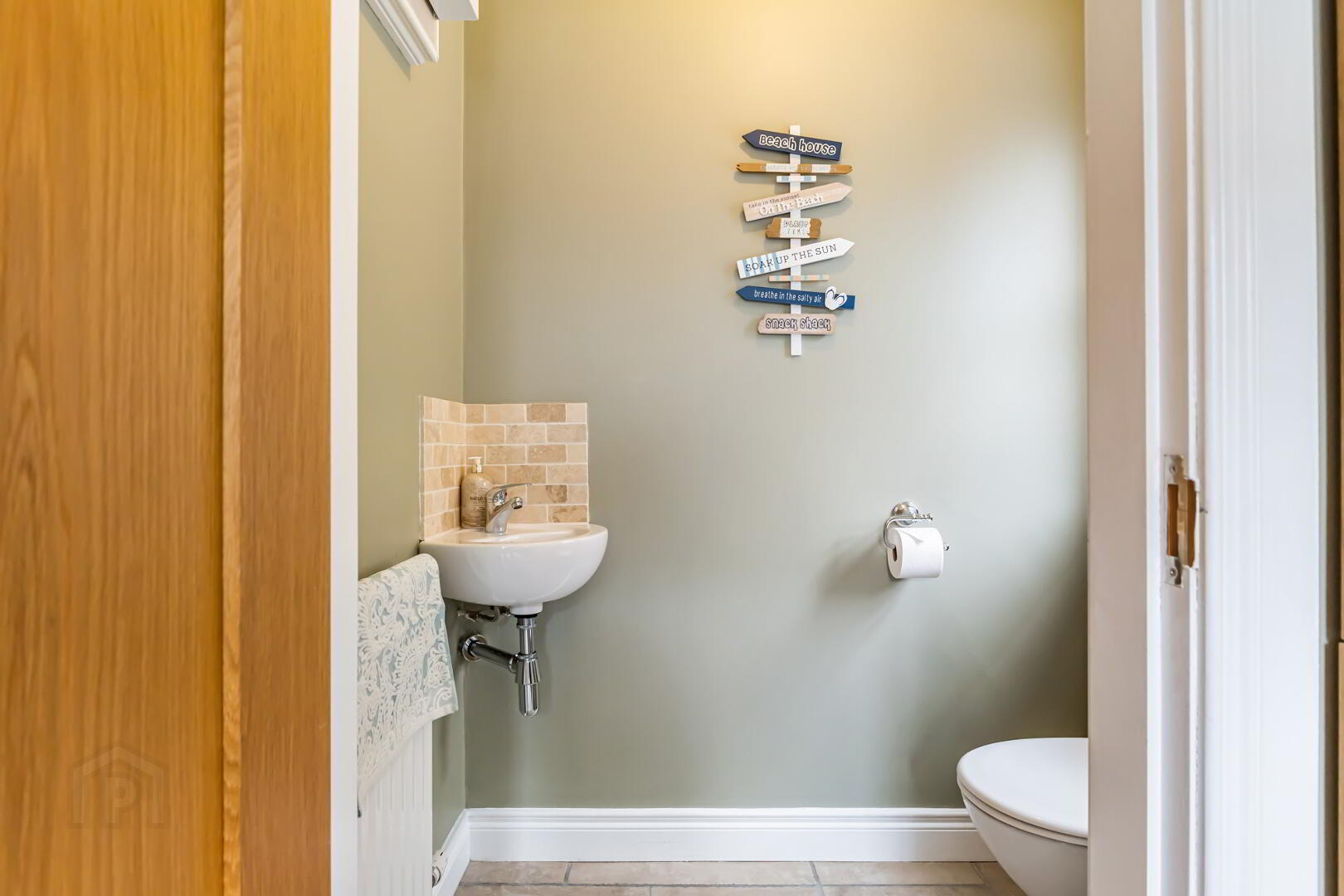 The solid oak kitchen offers a generous range of units, integrated appliances, and space for dining, while the separate utility room provides further storage and direct access to the rear garden. A convenient downstairs cloakroom completes the ground floor.