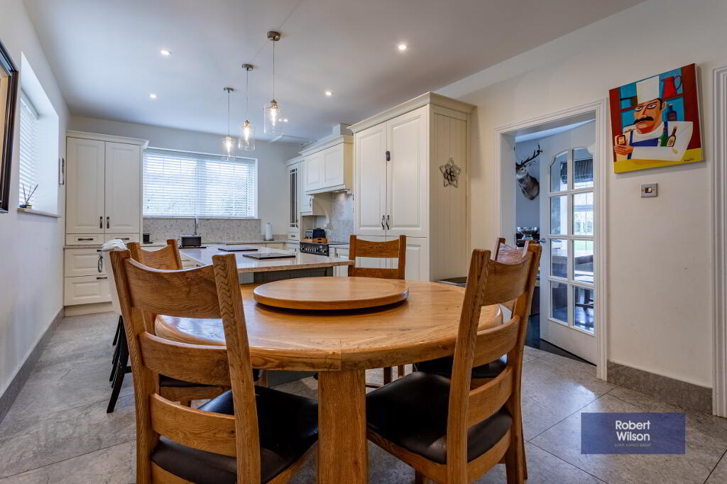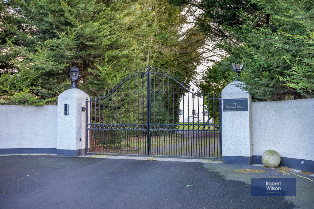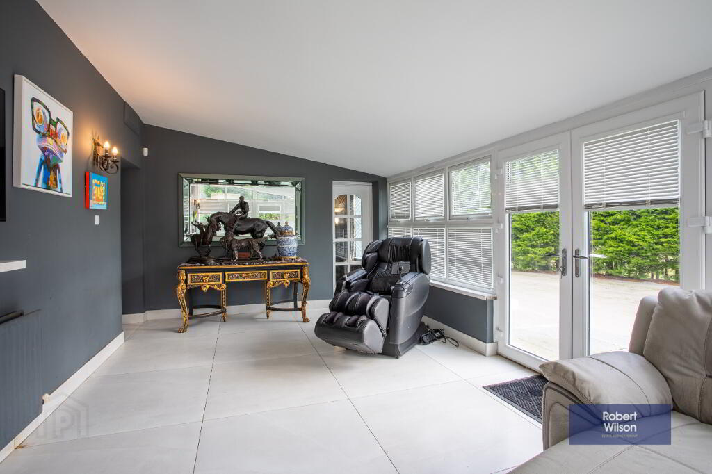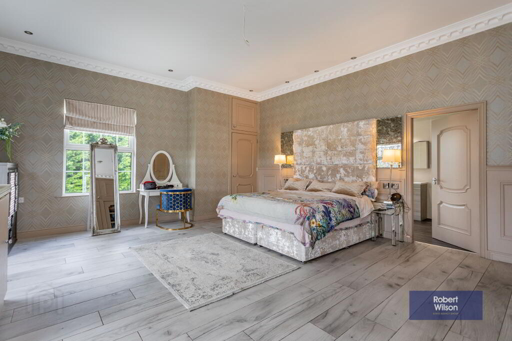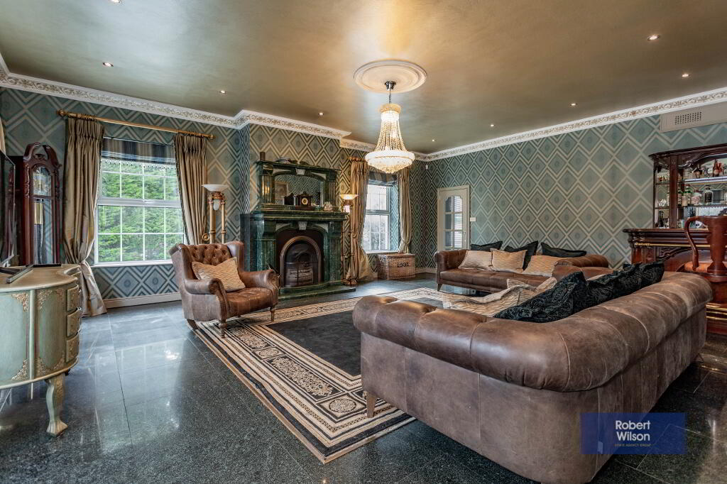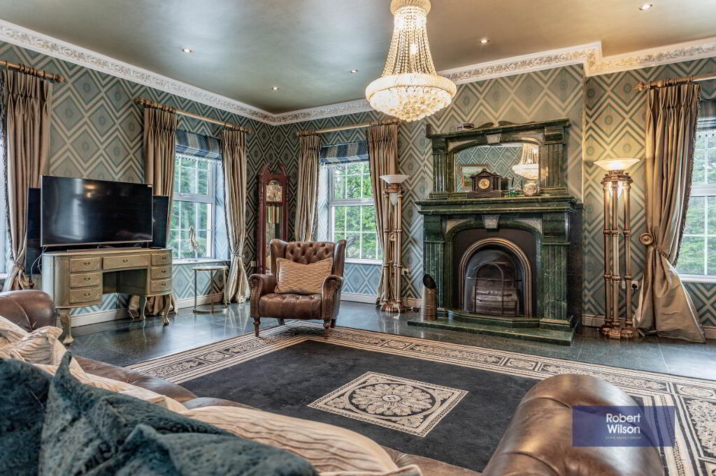 Nestled on circa.1.2 acres of mature, private grounds, 46 Milebush Road offers a stunning blend of timeless charm and modern sophistication. The grand entrance hall, with its double doors, sweeping staircase, and ornate detailing, sets the tone for this exceptional property. The ground floor features an impressive lounge with a green marble fireplace and an antique bar, a bespoke hand-painted oak kitchen with quartz finishes, a bright dining room with patio access, and a serene sunroom overlooking the gardens. Practical spaces, including a utility room and a stylish cloakroom, complete the layout.