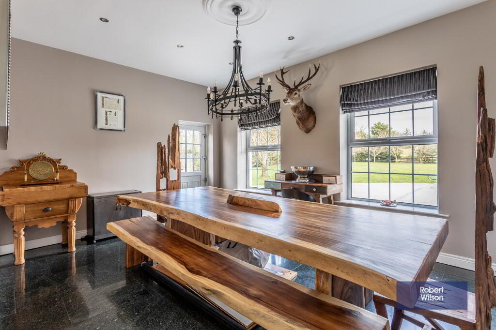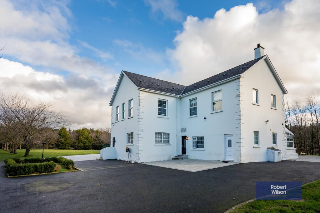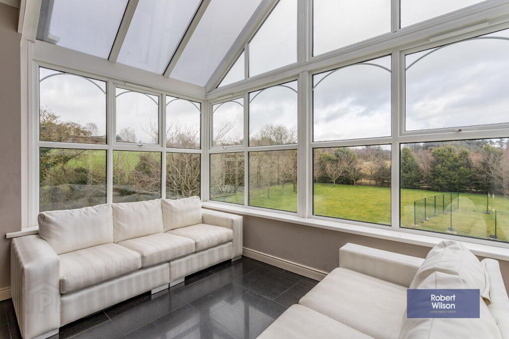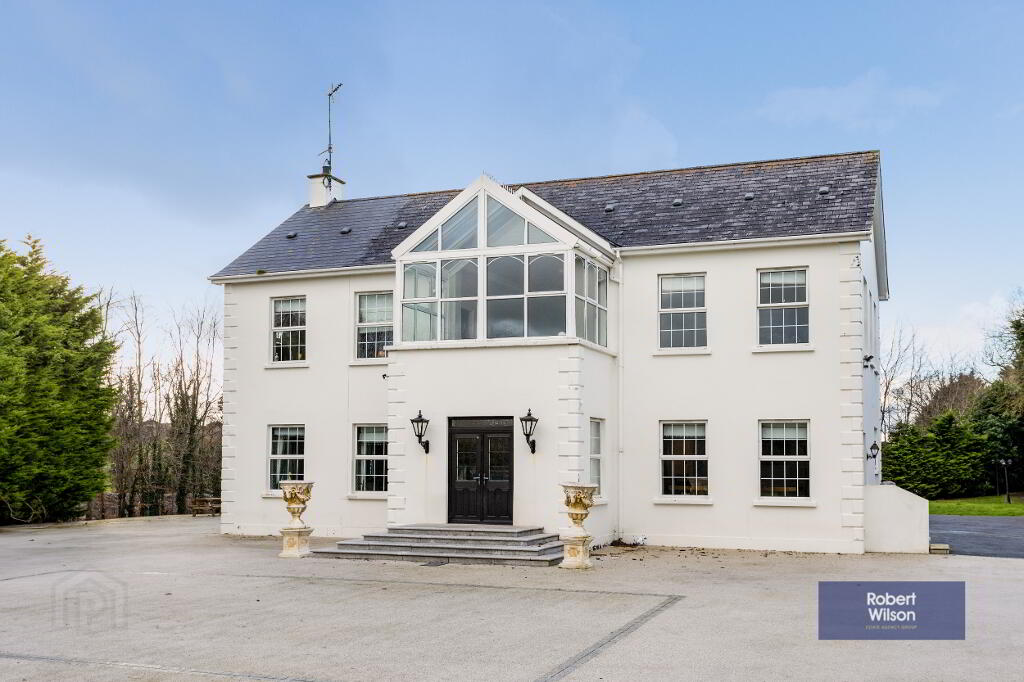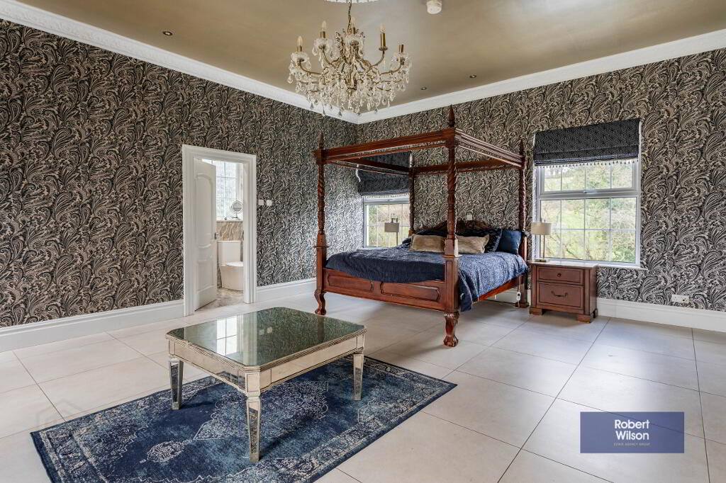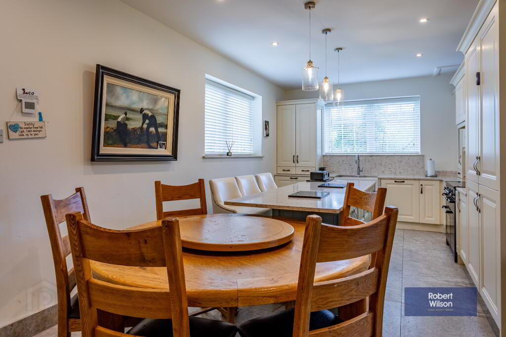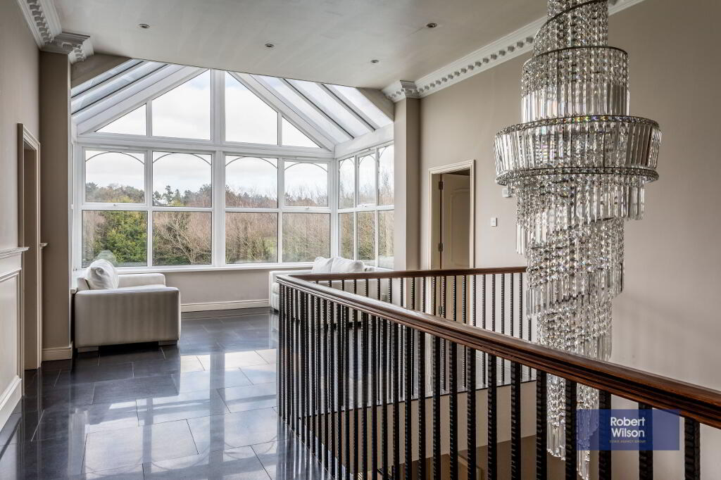 Nestled on circa.1.2 acres of mature, private grounds, 46 Milebush Road offers a stunning blend of timeless charm and modern sophistication. The grand entrance hall, with its double doors, sweeping staircase, and ornate detailing, sets the tone for this exceptional property. The ground floor features an impressive lounge with a green marble fireplace and an antique bar, a bespoke hand-painted oak kitchen with quartz finishes, a bright dining room with patio access, and a serene sunroom overlooking the gardens. Practical spaces, including a utility room and a stylish cloakroom, complete the layout.