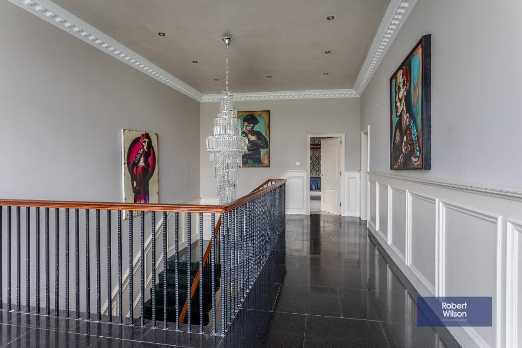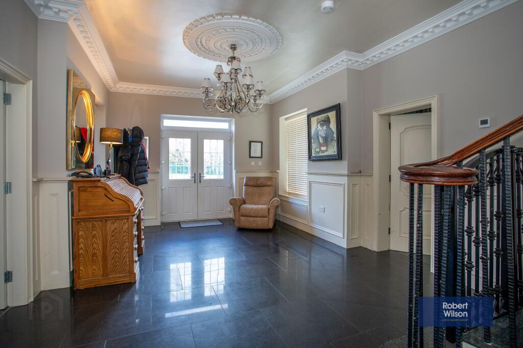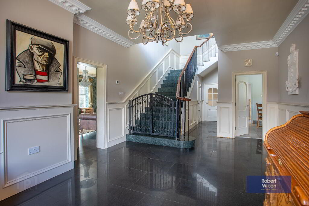 Double entrance doors, Tiled floor, Impressive staircase to first floor, ceiling rose and cornice, 1/2 panel walls
