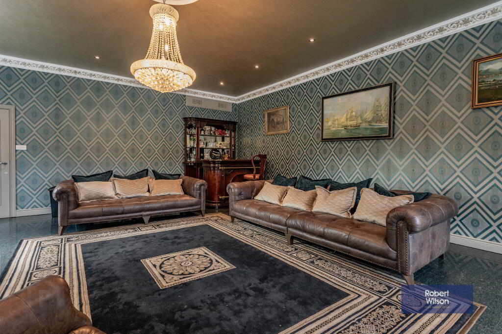 20' 1" x 24' (6.12m x 7.32m) Impressive period style green marble fireplace with cast iron inset, Porcelain tiled floor with central carpeted inset, Feature antique bar with brass rails, Recessed low voltage down-lights, Ceiling rose & ornate cornicing