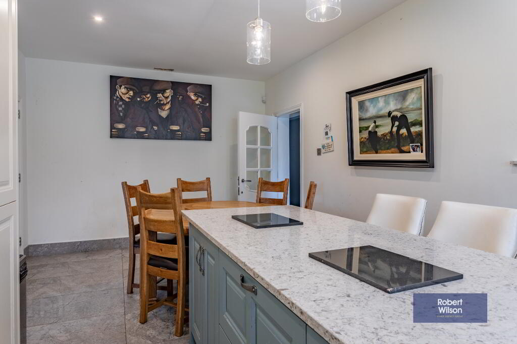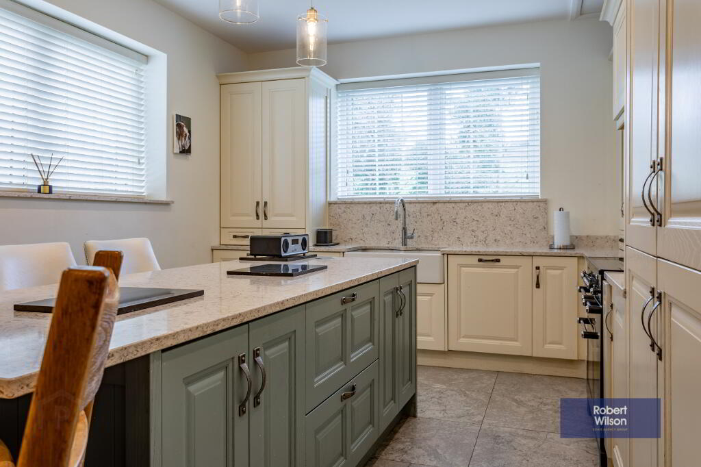 23' x 11' 7" (7.01m x 3.53m) Bespoke hand painted oak fitted kitchen with excellent range of high and low level units, quartz worktops, upstand and splash back, Integrated fridge freezer, Extractor hood, Space for range style cooker, Space for fridge, Double ceramic sink unit with 'Quooker' water tap, Integrated dishwasher, Centre island with electric point and storage under, Recessed low voltage down-lights, Tiled floor.