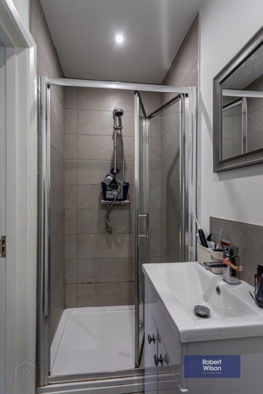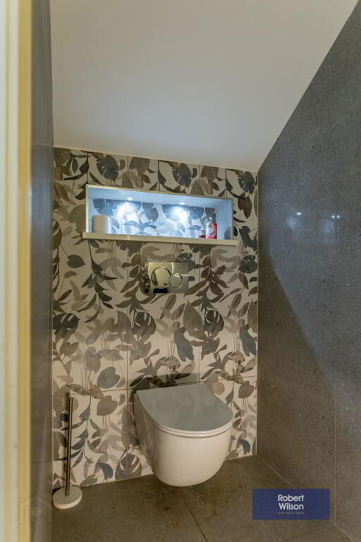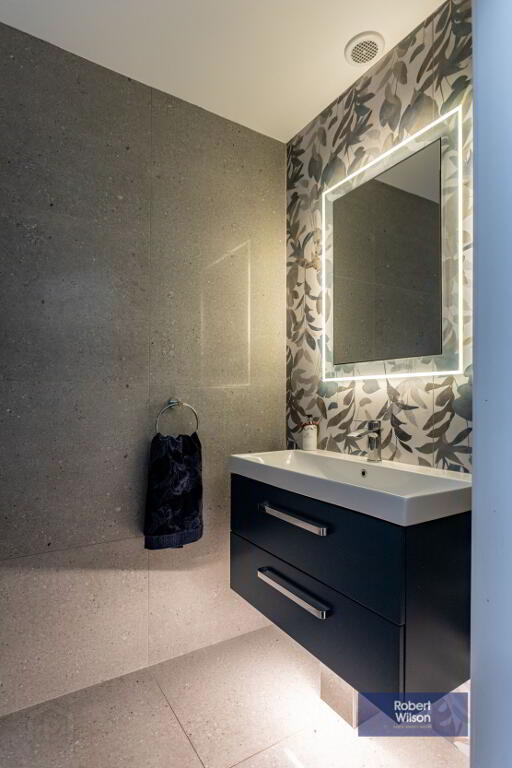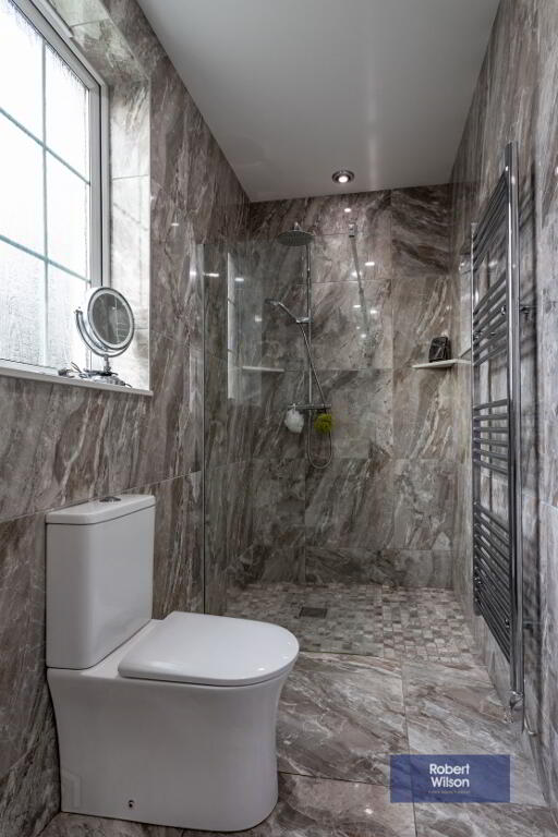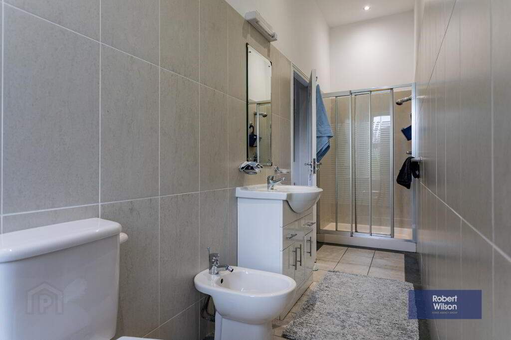 Low flush wc, Bidet, Pedestal wash hand basin, Fully tiled shower cubicle, Fully tiled walls and floor, Recessed low voltage down-lights