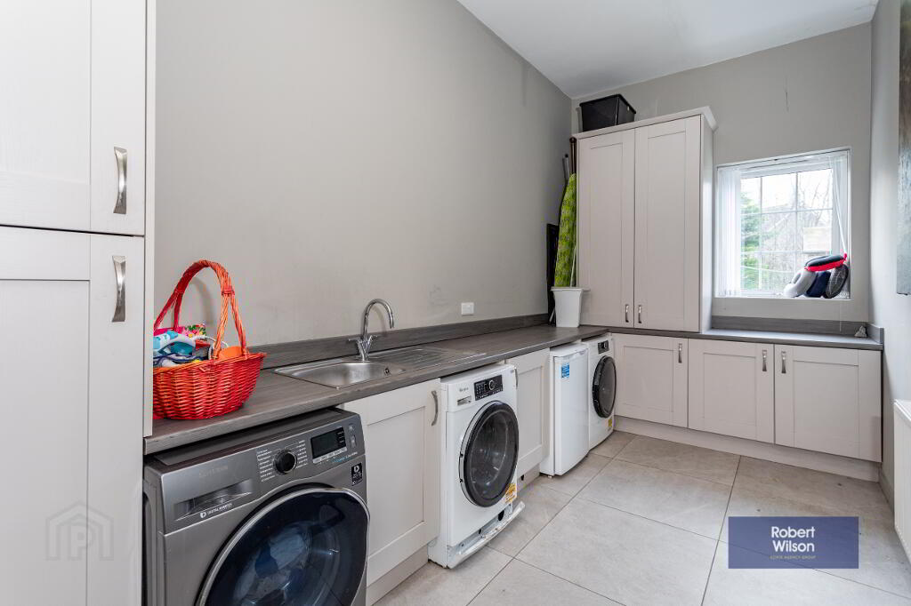 Range of high and low level units, space for 2x washing machines, space for tumble dryer, stainless steel sink unit, chrome mixer tap, tiled floor.