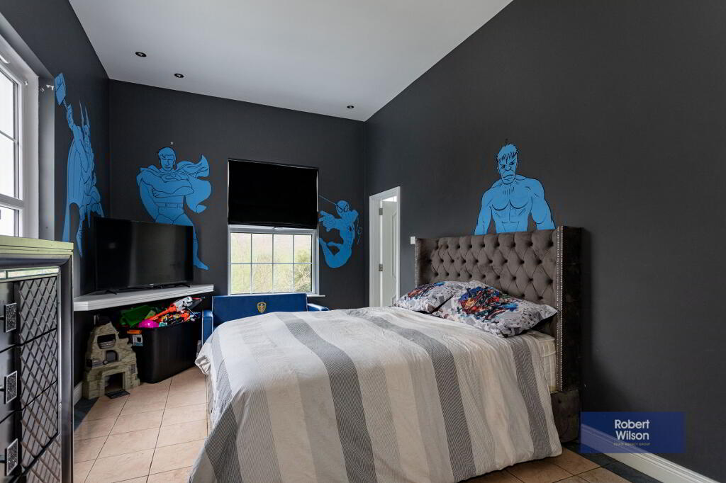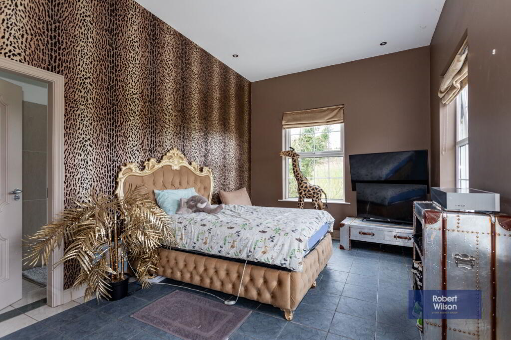 Upstairs, five spacious bedrooms offer refined comfort, each with fitted wardrobes and elegant tiled floors. The main bedroom boasts an opulent en-suite with a Jacuzzi bath, while additional en-suites and a Jack-and-Jill bathroom ensure convenience for the whole family. Every detail, from recessed lighting to hand-painted furnishings, reflects the home’s impeccable design.