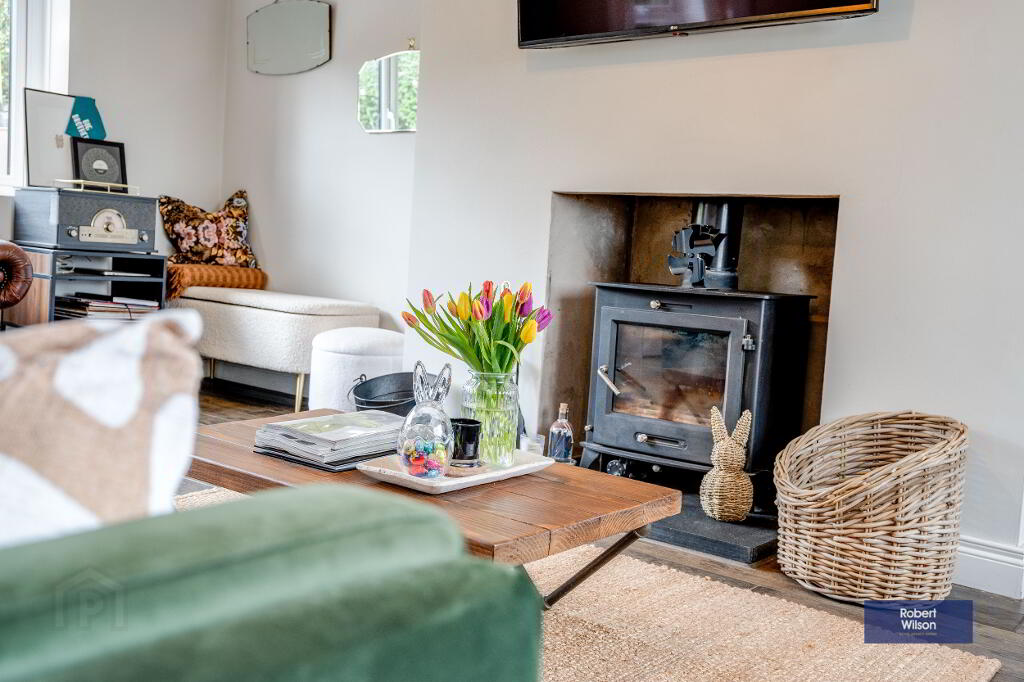 5.5m x 3.7m (18' 1" x 12' 2") 12kw Boiler stove inset on granite hearth