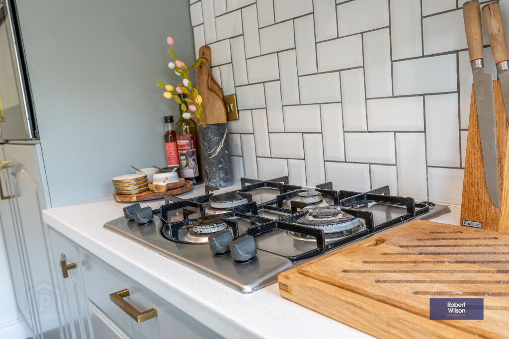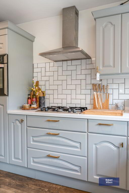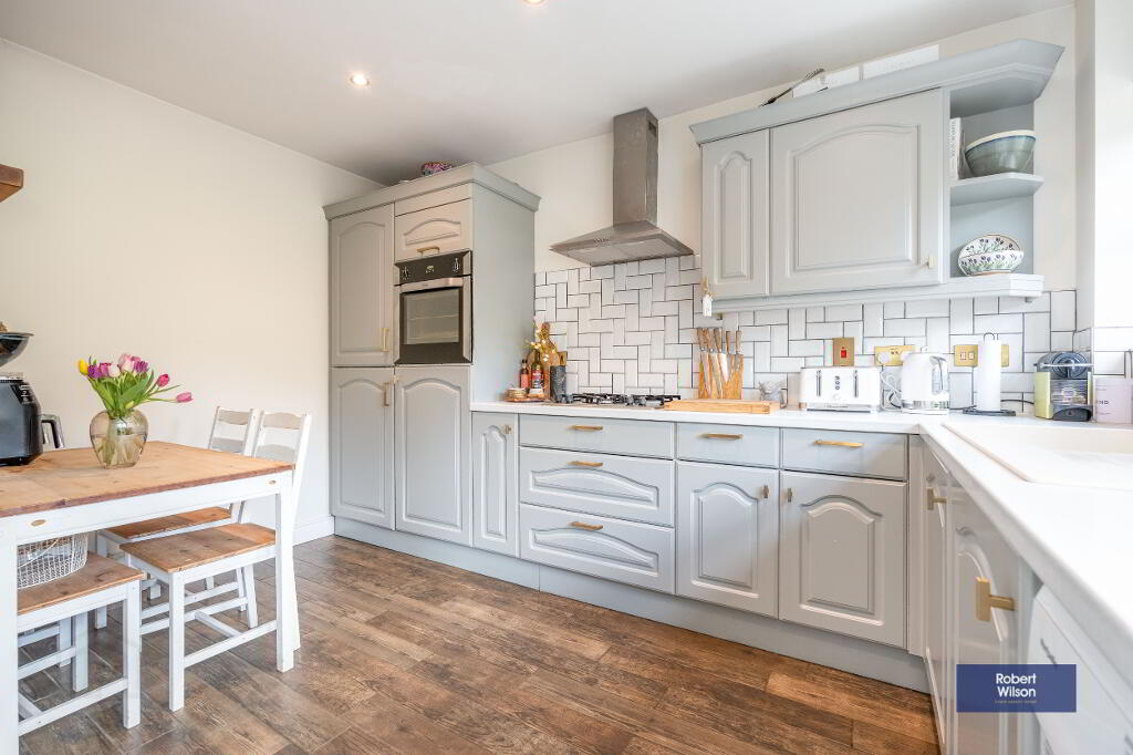 3.9m x 3.4m (12' 10" x 11' 2") Fitted kitchen in grey with range of high and low level units, stone effect laminate work top, tiled splash back, composite sink in white with brass mixer tap, 4 ring gas hob, extractor hood, integrated fridge freezer, eye level oven and grill, recessed lighting, vertical radiator, space for washing machine and tumbler dryer, wood effect tiled flooring, pvc door to rear garden.