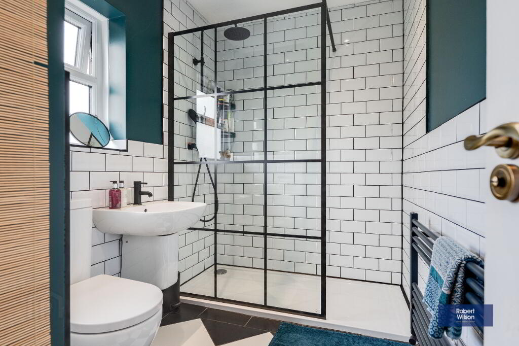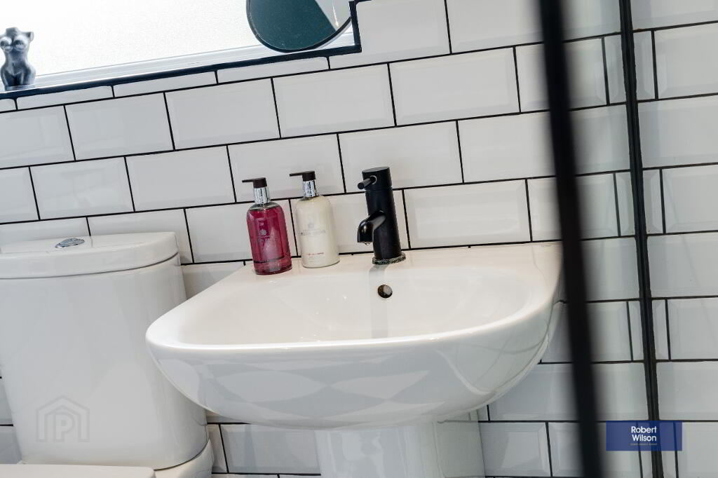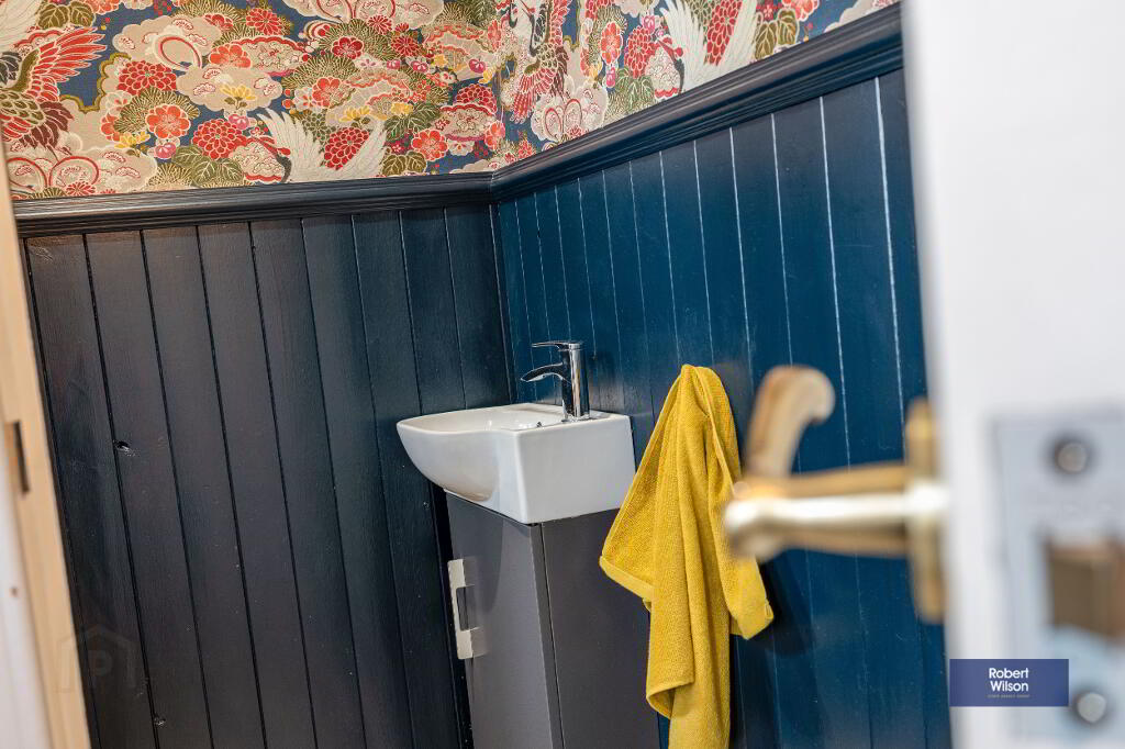 1.2m x 1.5m (3' 11" x 4' 11") Low flush WC, wash hand basin with vanity incorporated, mosaic tiled flooring, half panelled walls, extractor fan, recessed lighting.