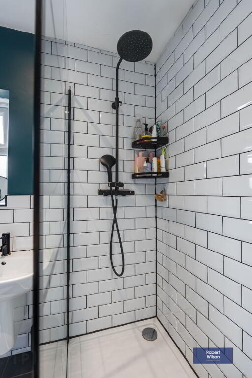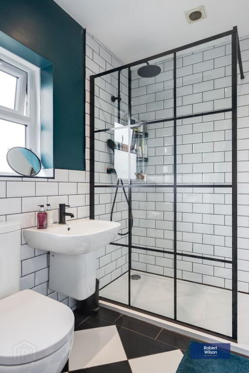 2.8m x 1.7m (9' 2" x 5' 7") White suite comprising, low flush WC, semi pedestal wash hand basin, large walk in shower cubicle with rainfall and telephone fittings, tiled flooring, part tiled walls, recessed lighting, extractor fan, hot press with shelving.