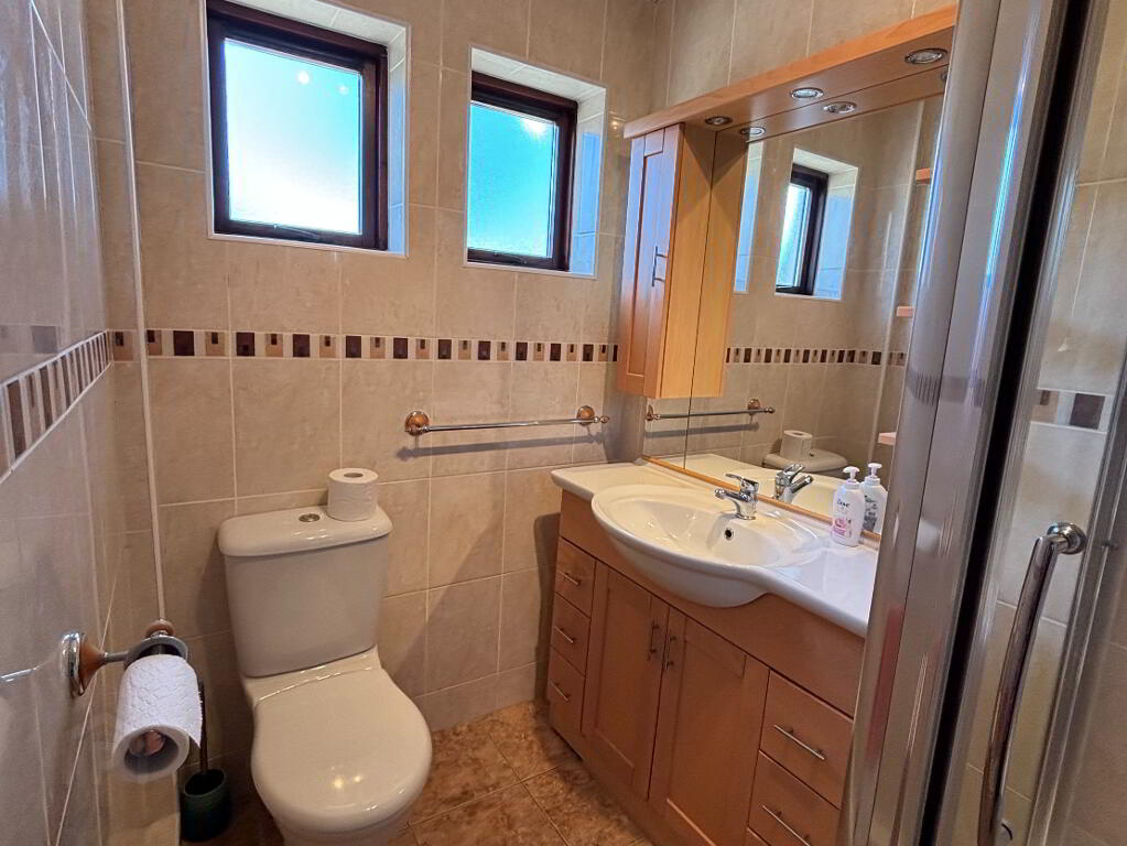 Good range of high and low level units, laminate worktop, stainless steel sink unit with mixer tap, eye level double oven, 4 ring stainless steel hob with extractor over, space and plumbed for automatic washing machine, storage cupboard off housing water cylinder. Part tiled walls and double panel radiator.