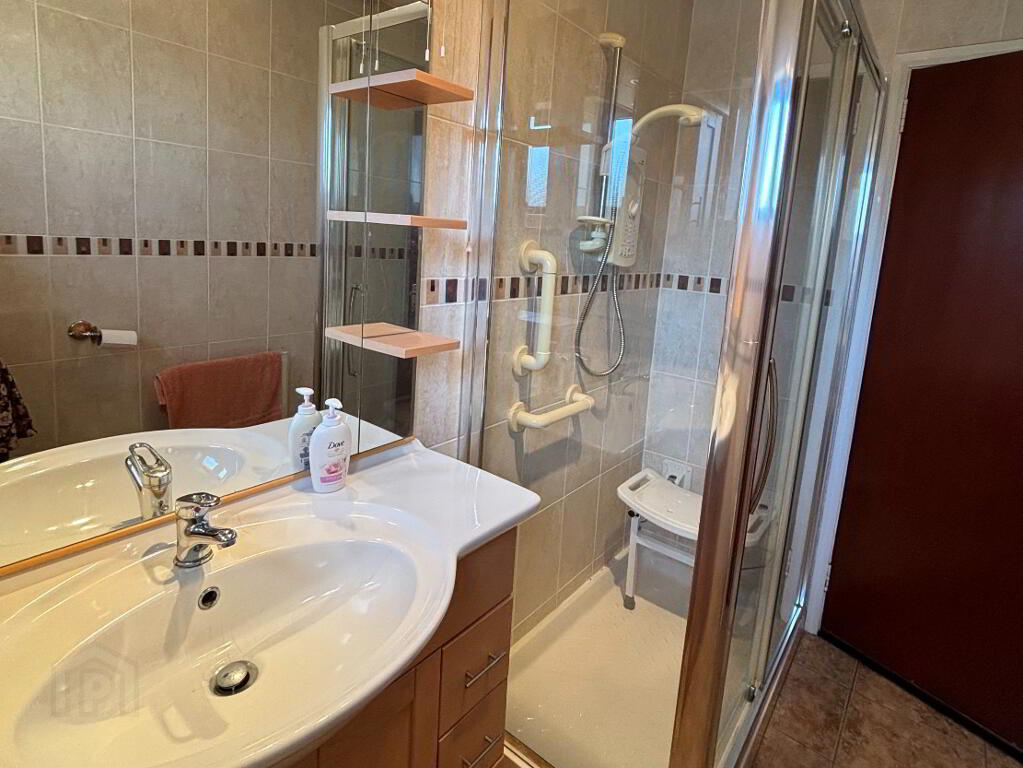 1.41m x 2.44m (4' 8" x 8' 0") White suite comprising; low flush w.c, vanity incorporated wash hand basin, large walk in shower with 'Mira' electric shower, tiled floor, tiled walls, extractor fan and single panel radiator.