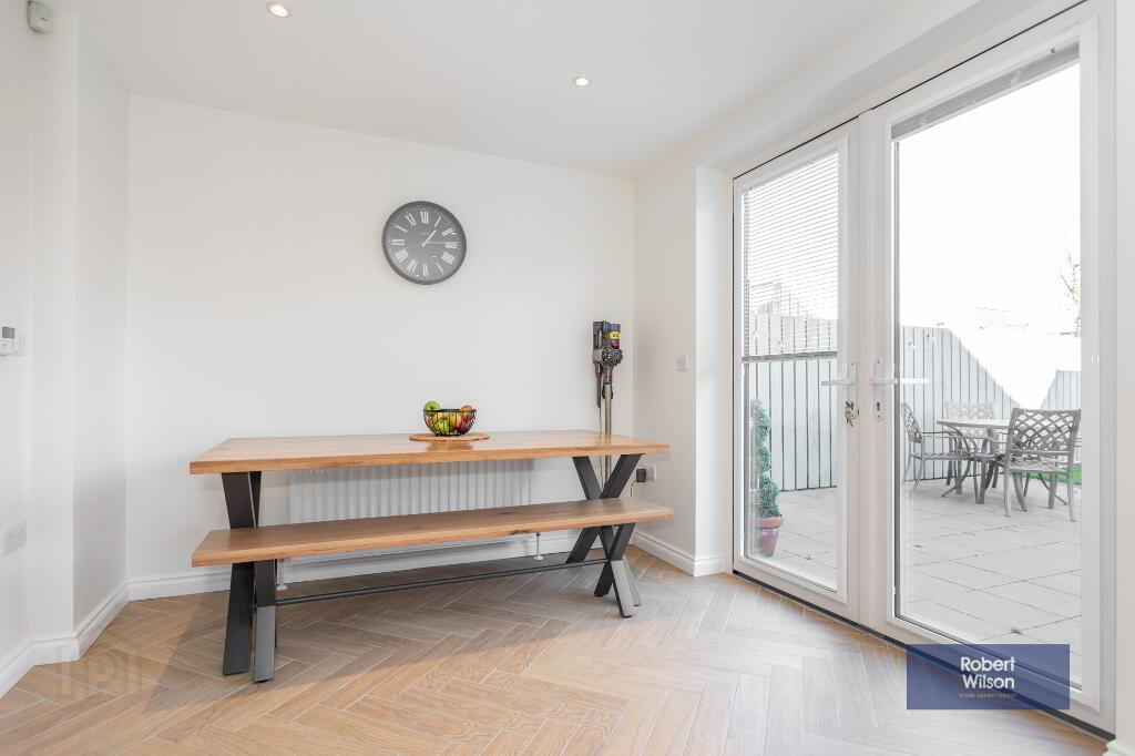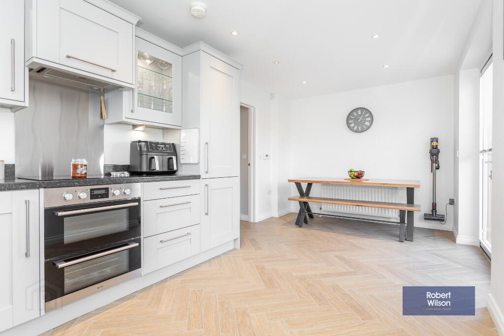 5.75m x 2.75m (18' 10" x 9' 0") Excellent fitted kitchen with range of high and low level units, 1 1/2 bowl stainless steel sink unit with mixer taps. Laminate work tops. Double oven with 4 ring ceramic hob and extractor fan over. Integrated fridge freezer. Recessed lighting. Patio doors to garden.