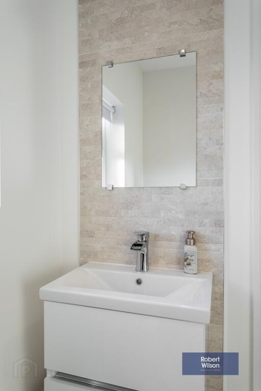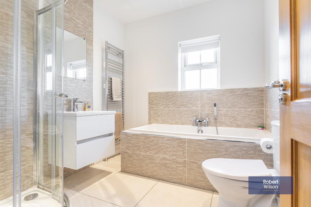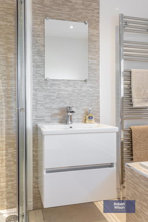 2.45m x 2.3m (8' 0" x 7' 7") White suite comprising low flush wc, bath tub with mixer tabs and telephone fitting, tiled panels, wash hand basin with vanity unit incorporated, chrome heated towel rail, walk in shower cubicle with rainfall fitting and telephone fitting, tiled floor, recessed lighting and extractor fan.