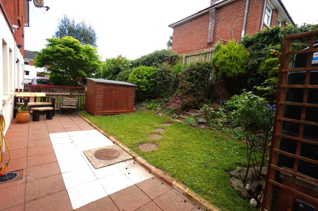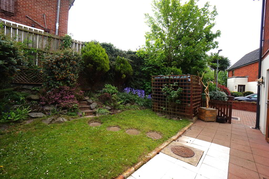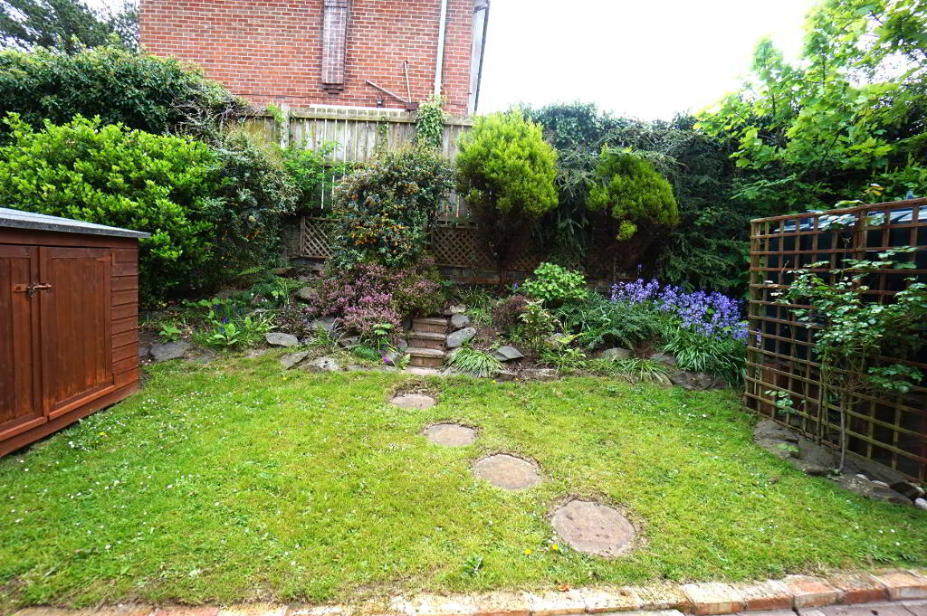 Rear garden in lawn with various plants and shrubs, patio area, outside water tap.