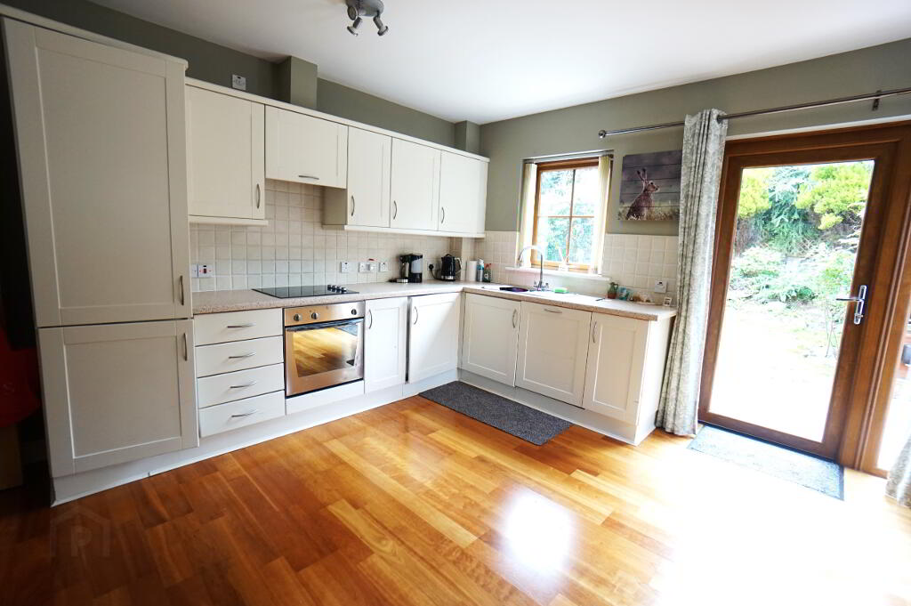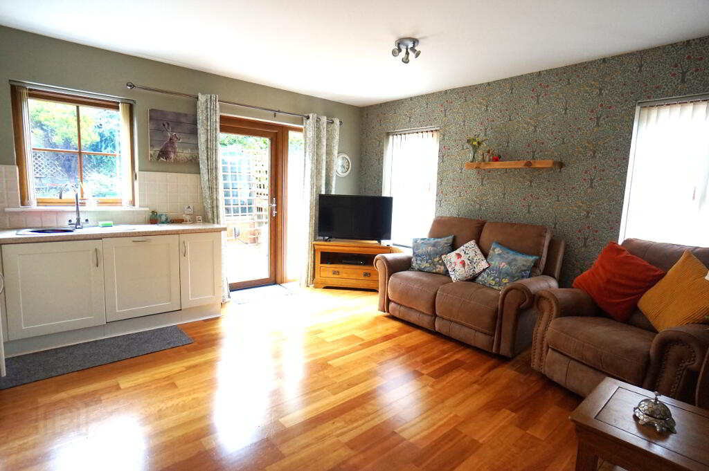 4.26m x 4.54m (14' 0" x 14' 11") Range of high and low level units with laminate worktop, part tiled walls, stainless steel sink unit with mixer tap, single oven with 4 ring ceramic hob and extractor fan over, integrated washing machine, integrated dishwasher, integrated fridge freezer, French doors to rear patio area, double panel radiator, wood effect strip flooring.
