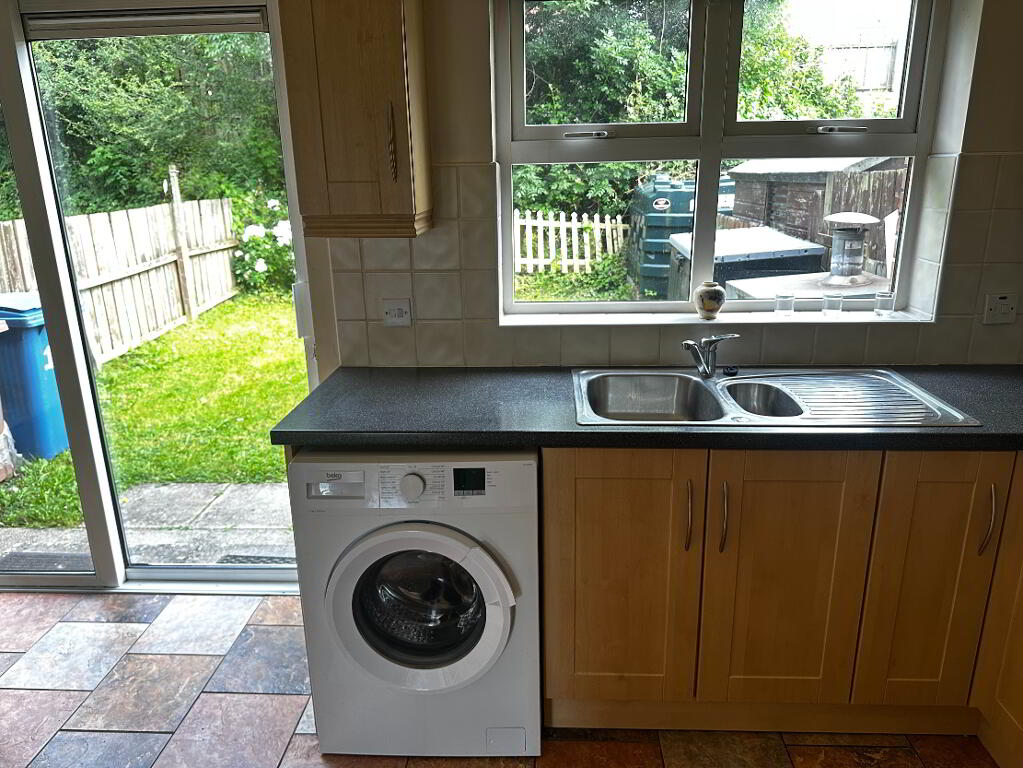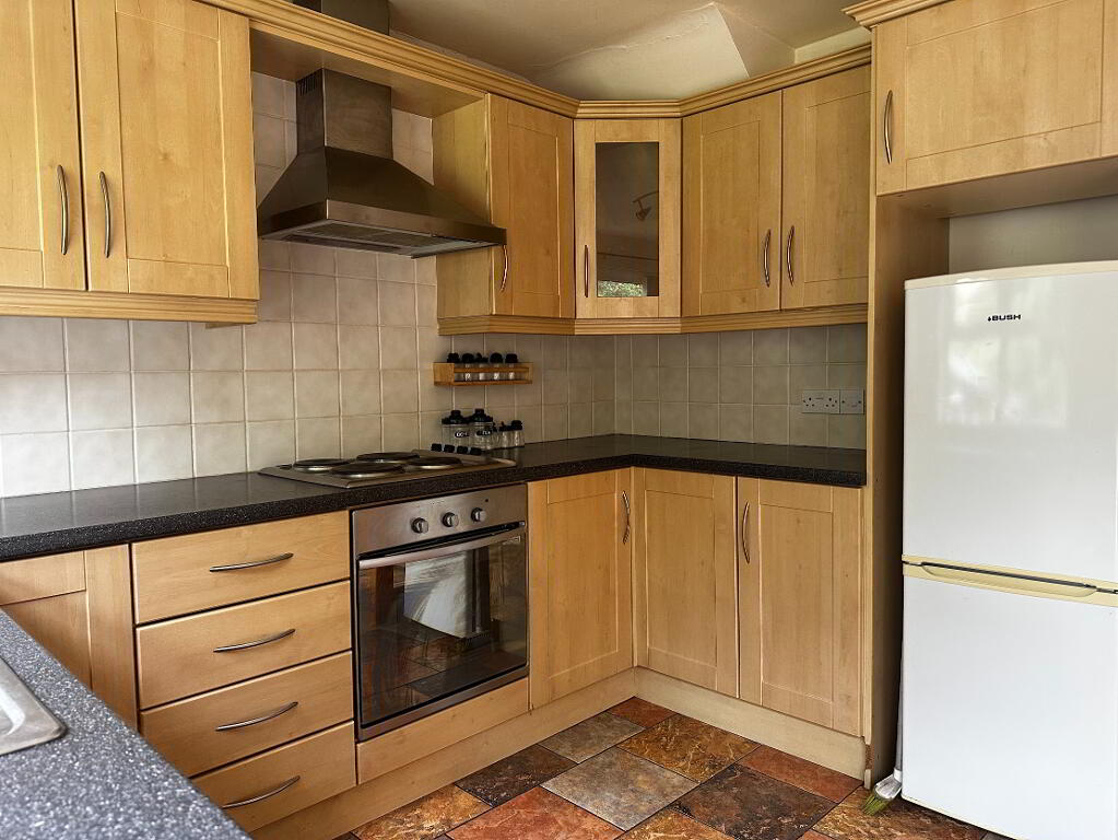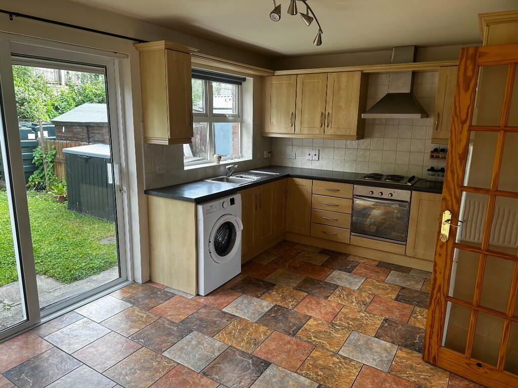 4.93m x 3.11m (16' 2" x 10' 2") Tile flooring and double panel radiator. Range of high and low level wood effect units, black worktop, 1.5 stainless steel sink. Electric oven and hob with stainless steel canopy, space for fridge/freezer and double sliding doors to rear garden.